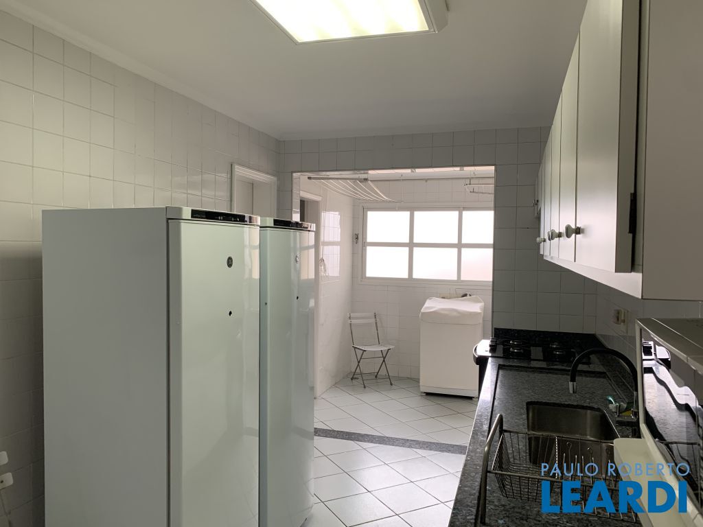 Uma sala em L, cozinha com armários e despensa, área de serviço e banheiro .
