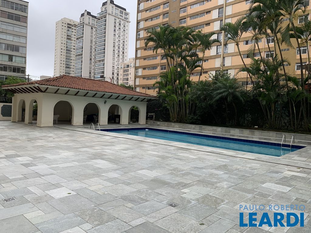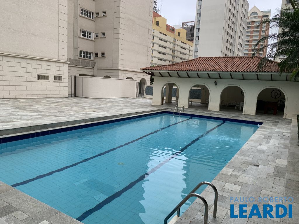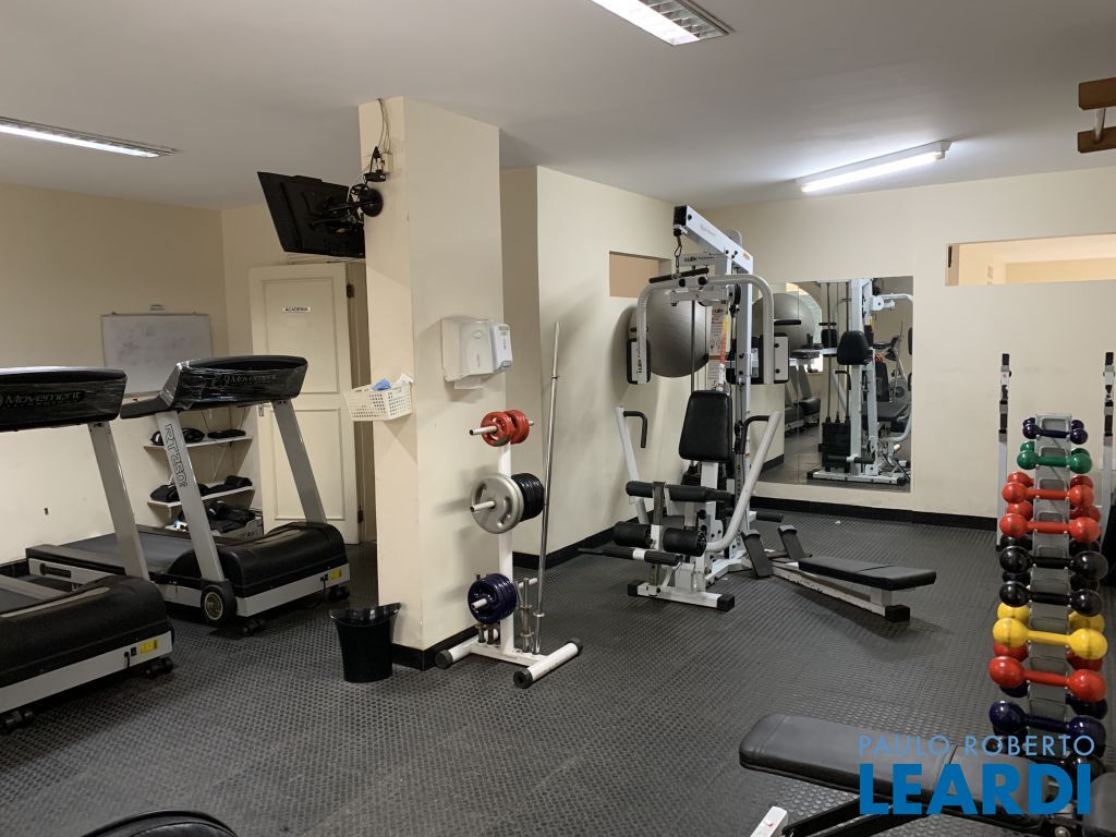 Área de lazer do prédio com piscina aquecida, salão de festas e academia.