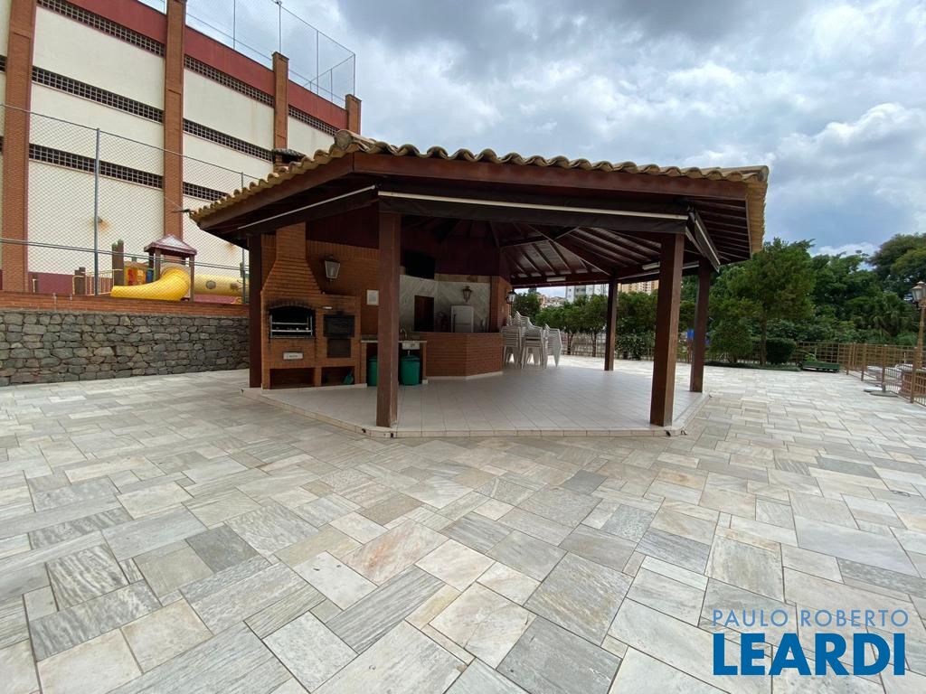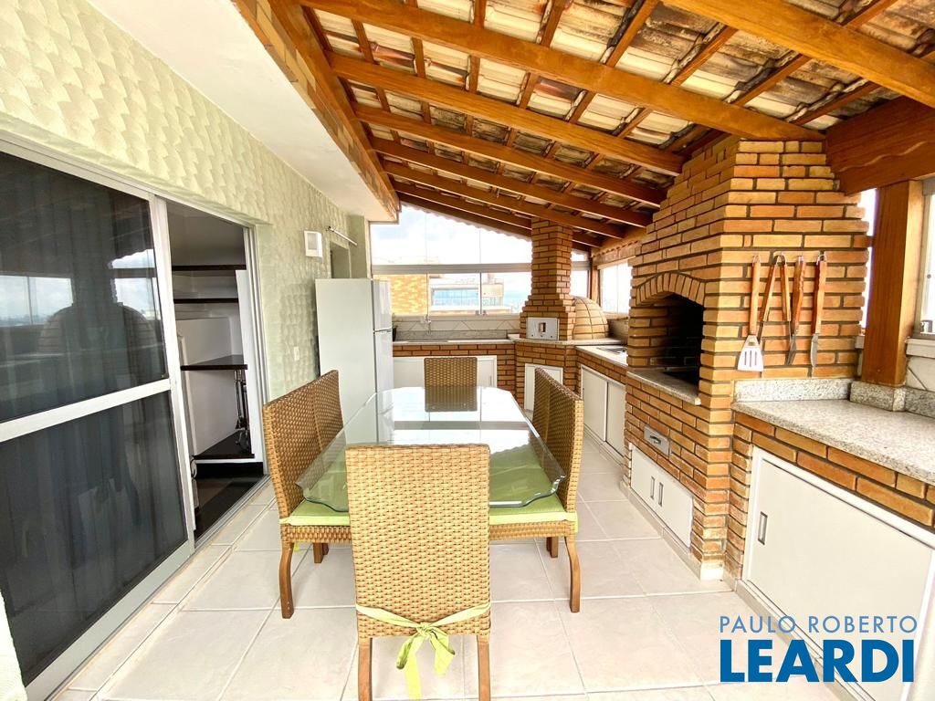 Um dos destaques do apartamento é a sua área externa coberta, que inclui uma churrasqueira e um forno de pizza, perfeitos para receber amigos e familiares em momentos de lazer. A área é complementada por uma mesa, geladeira e armários.