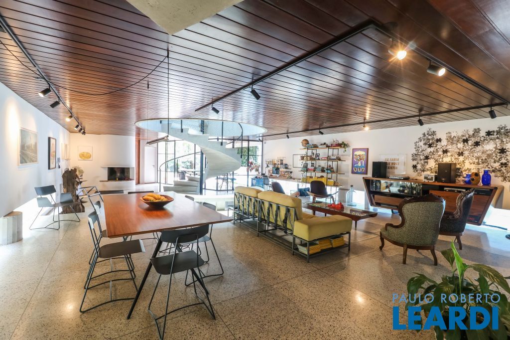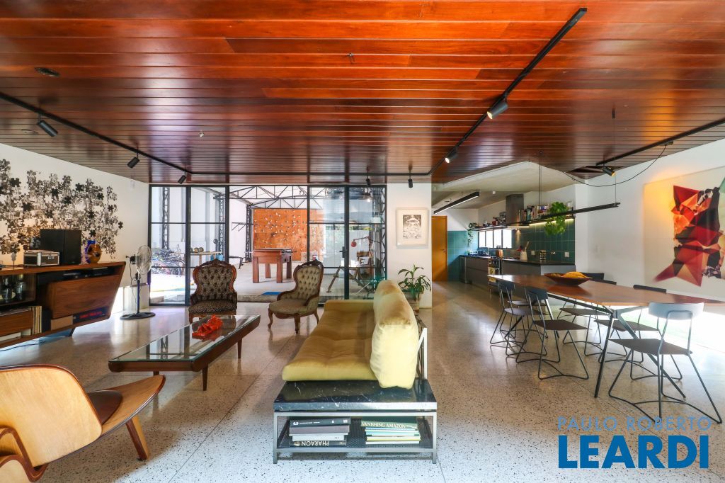 Amplo living com lareira, integrado com sala de jantar e área externa