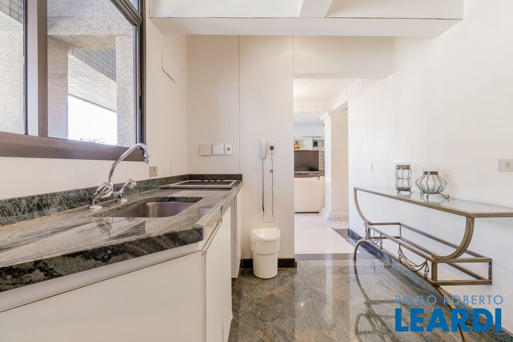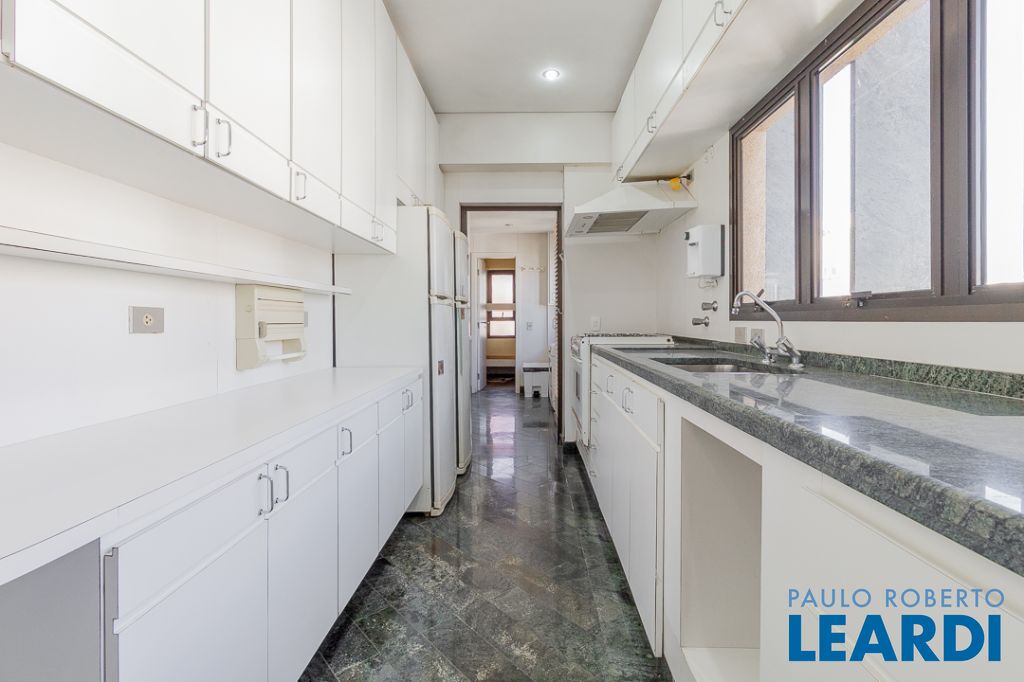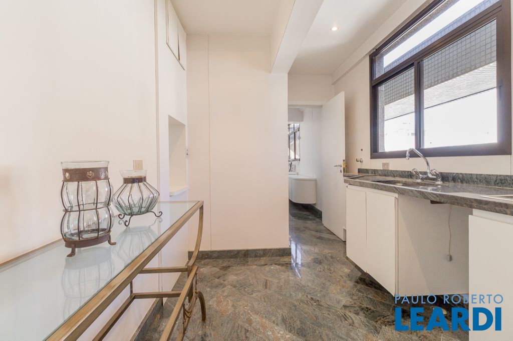 A charmosa sala de almoço conecta-se a uma cozinha ampla, funcional e repleta de armários planejados, equipada com prático elevador passa-prato. A área de serviço é extremamente ventilada e conta com dependências completas para funcionários.