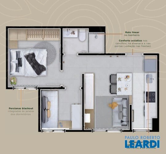 Apartamento de 45m² em andar alto, com 2 dormitórios, sala, cozinha, banheiro social e 1 vaga de garagem demarcada e coberta. Ambientes iluminados durante todo o dia e vista livre garantem conforto e privacidade.