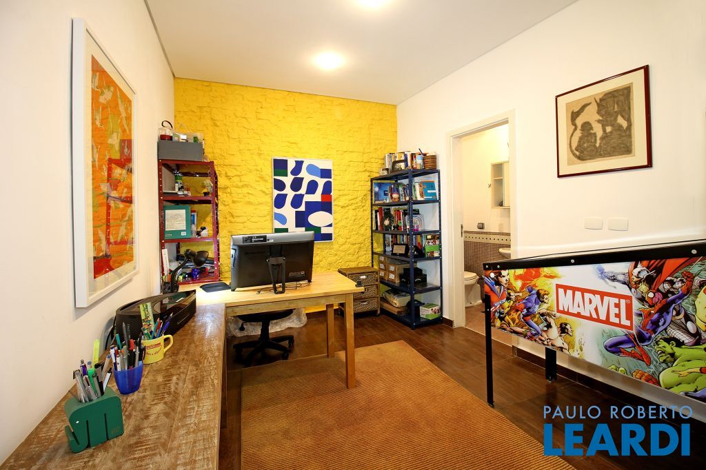 No térreo, um escritório com entrada independente, ideal para quem recebe clientes ou trabalha de casa.