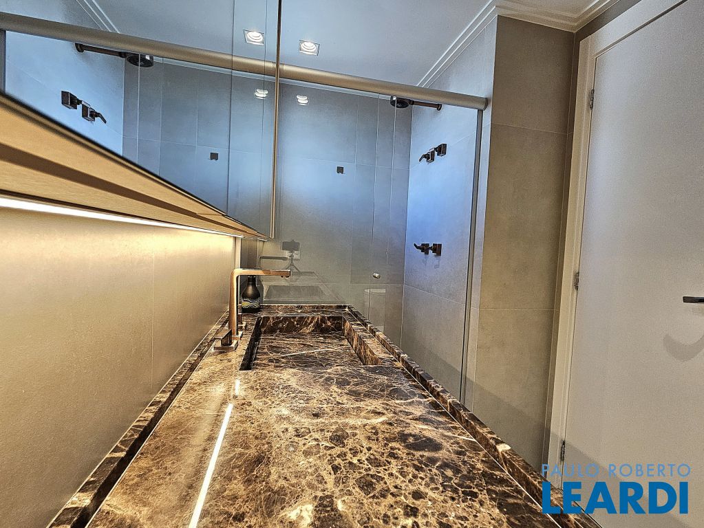 Banheiro da Suíte máster com acabamento em mármore Marrom Imperador.