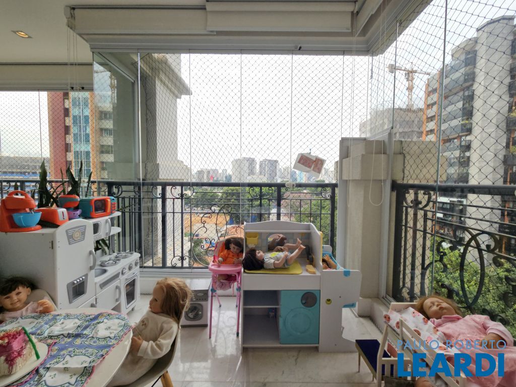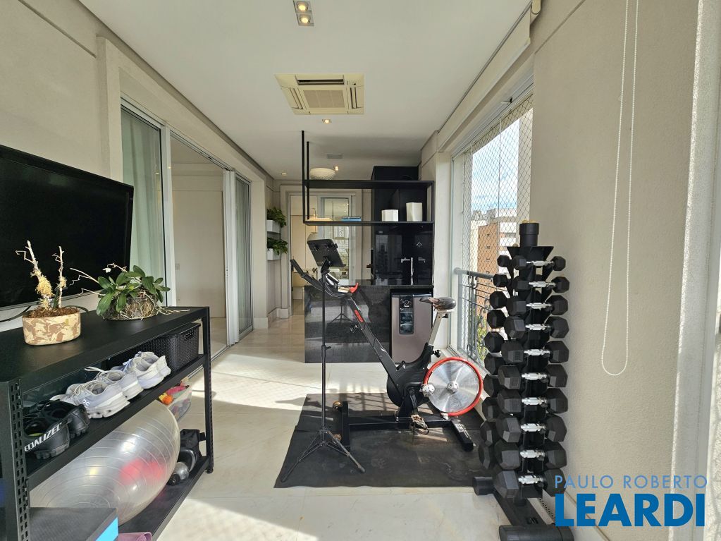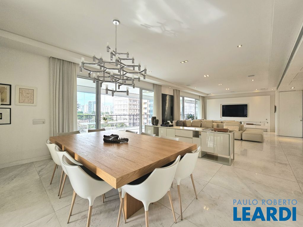 A área social tem piso em mármore, integração entre os ambientes e sistema de som e automação de iluminação Lutron. A varanda em L percorre toda a extensão da sala, conectando o living, a sala de jantar e o espaço gourmet, que também se abre para a sala de almoço.