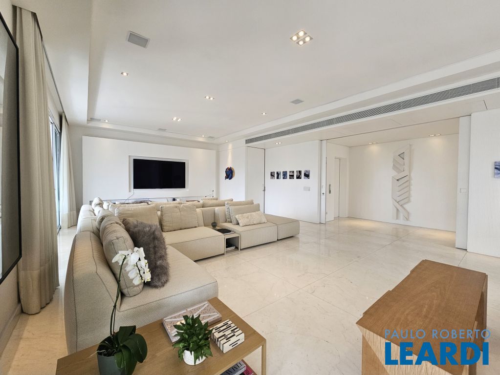 Logo na chegada, o hall social já antecipa o clima do apartamento: elegante, bem resolvido e marcado por proporções generosas em seus 400 m² e pé-direito alto em todos os ambientes.