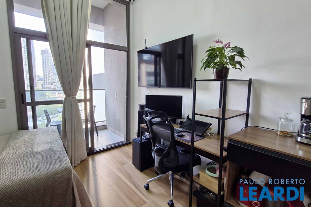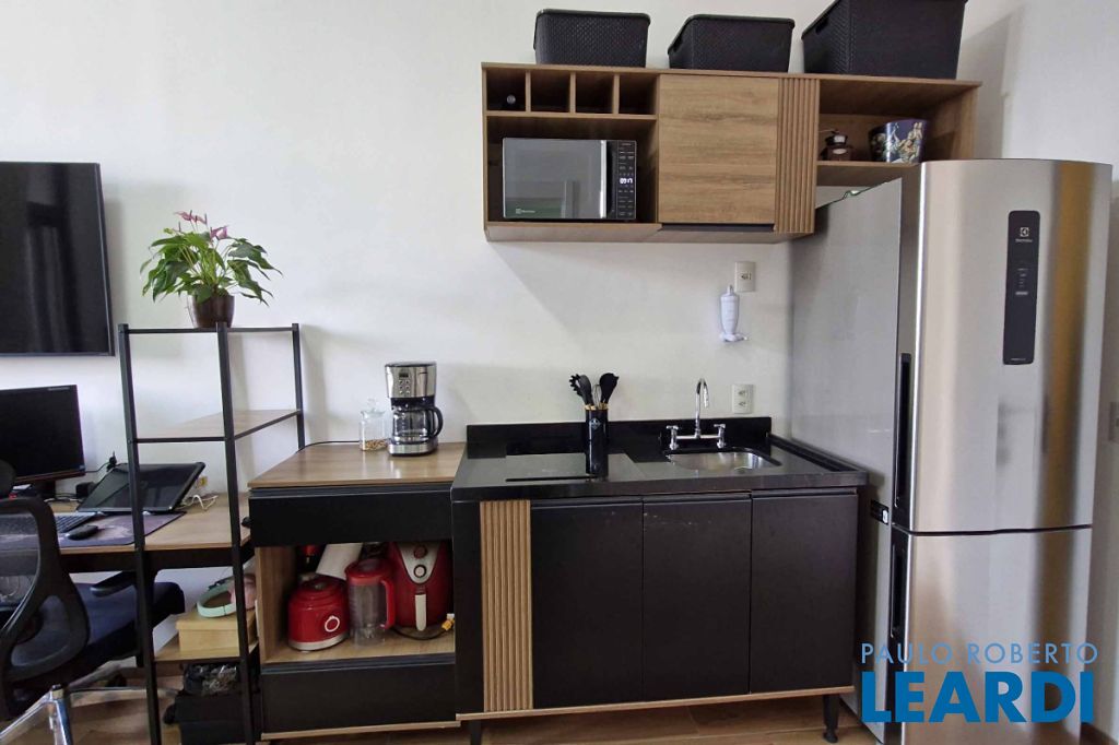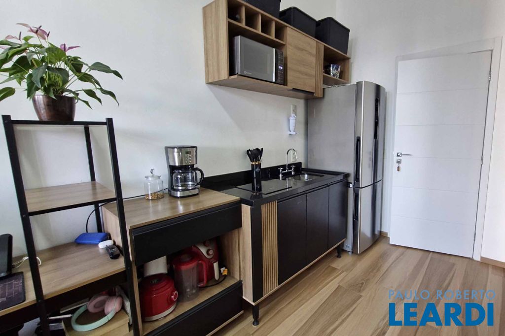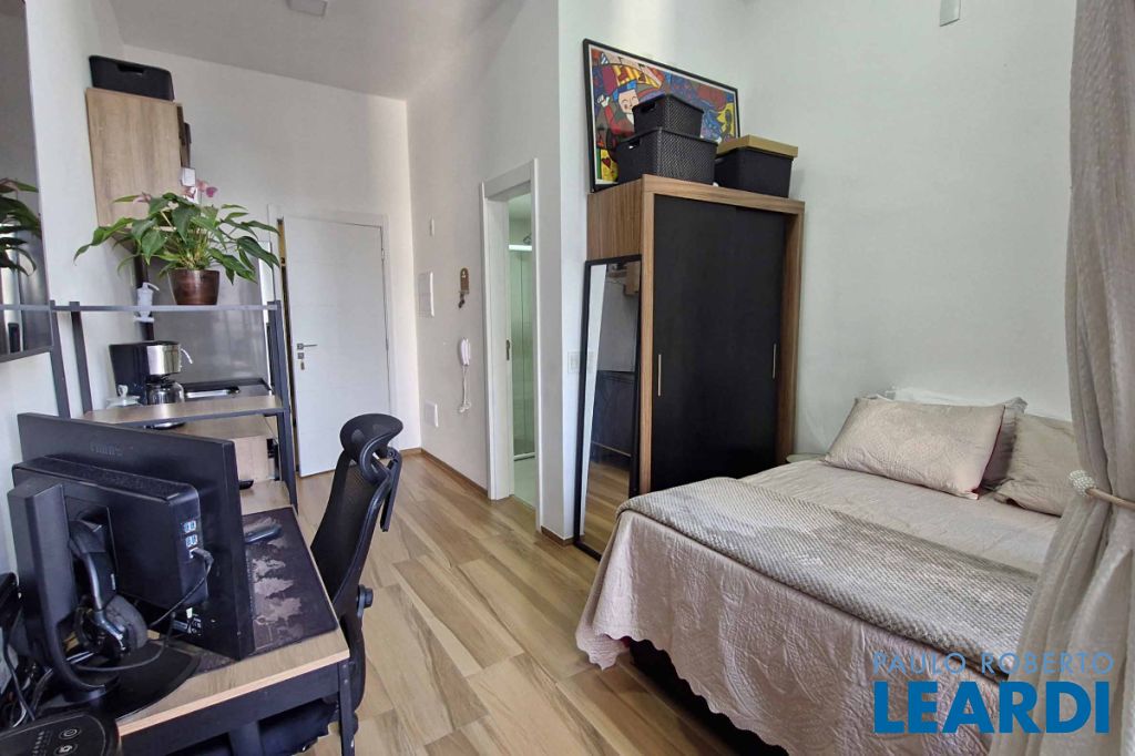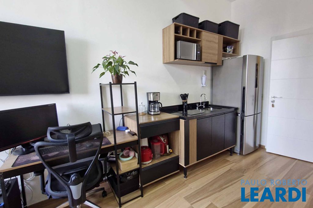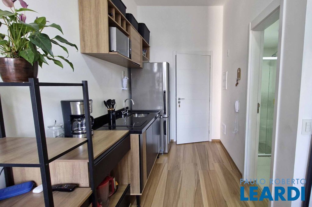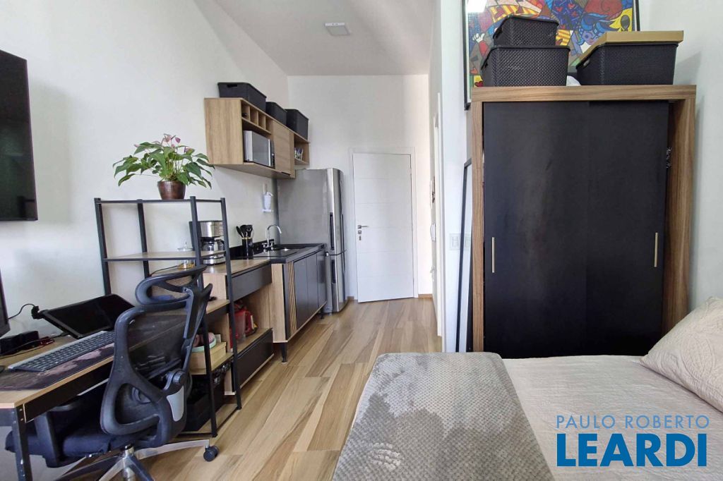 e bem integrado, dispondo de um dormitório e um banheiro. A cozinha é funcional, equipada com armário e fogão de