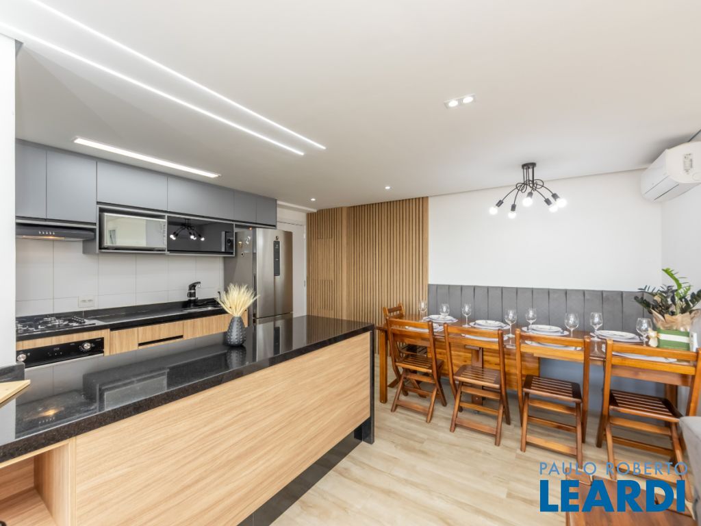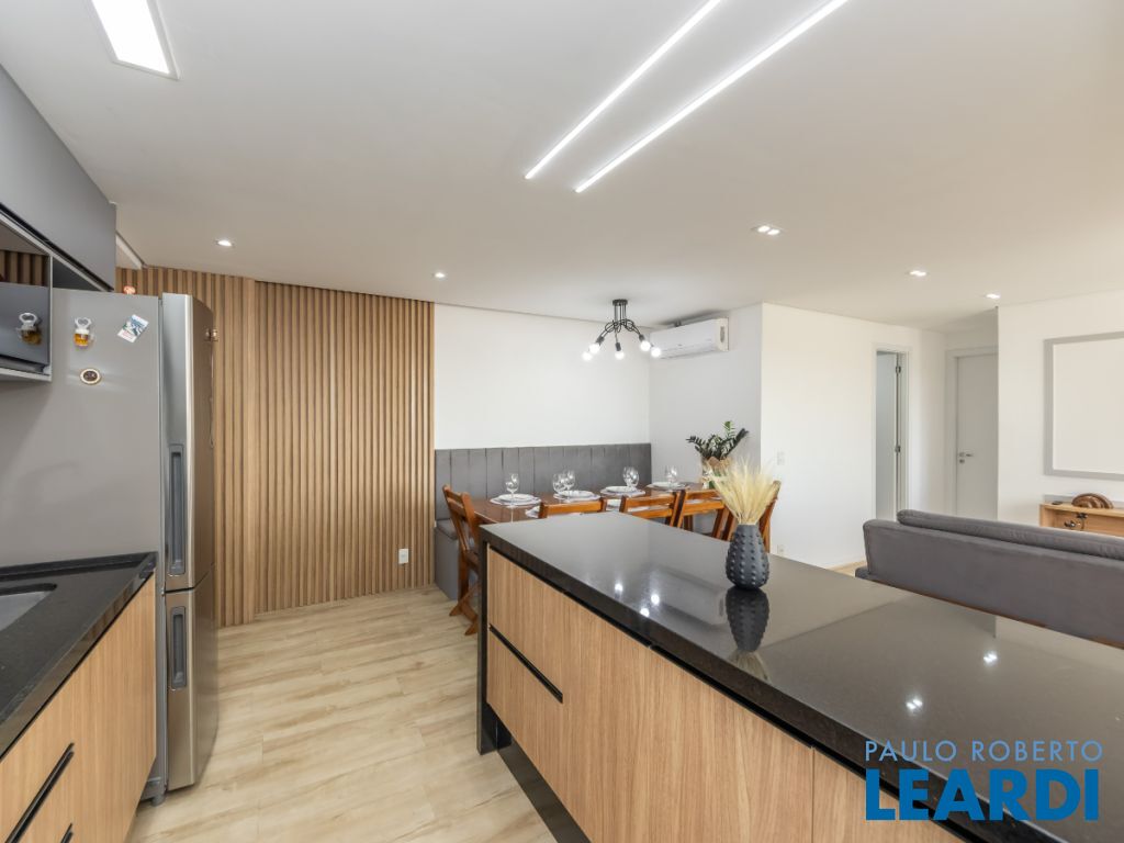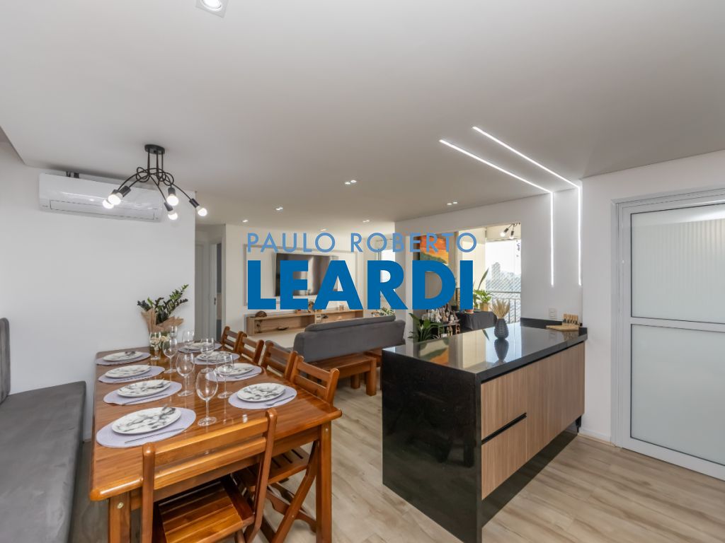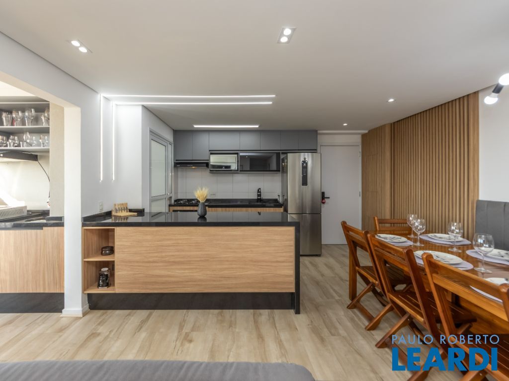 A cozinha americana é um destaque à parte equipada com cooktop, forno embutido e armários sob medida, combina praticidade e beleza em um só espaço. O apartamento conta ainda com 2 banheiros completos, área de serviço planejada, ar-condicionado instalado e 1 vaga coberta.