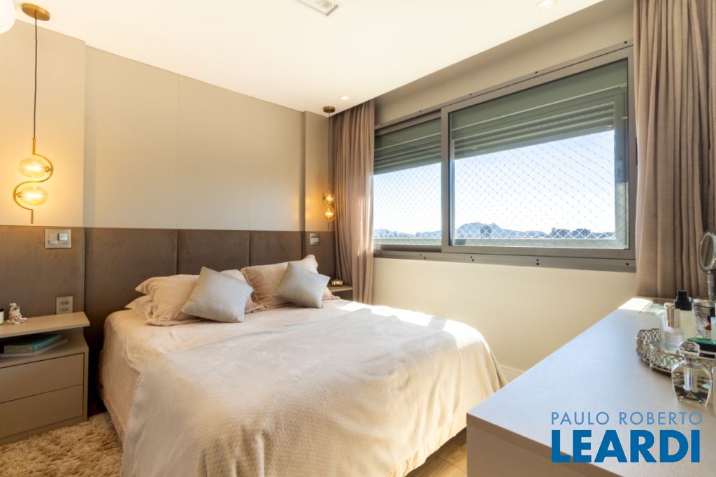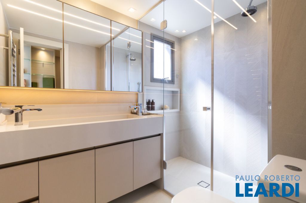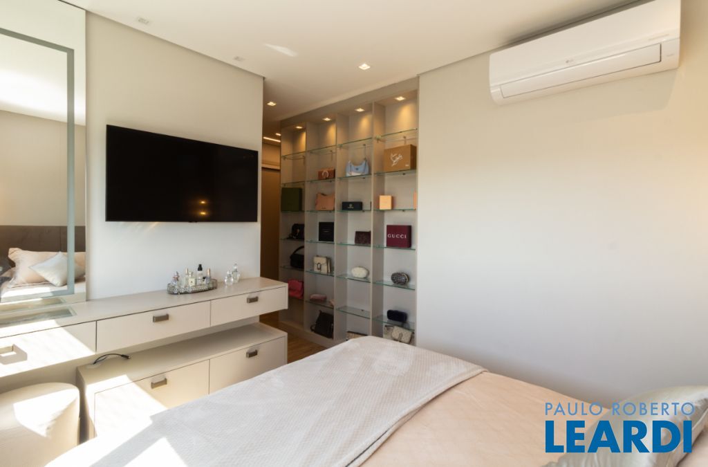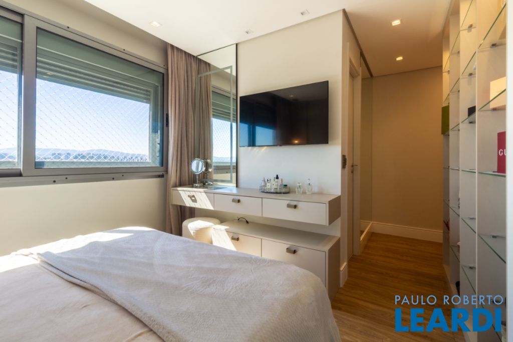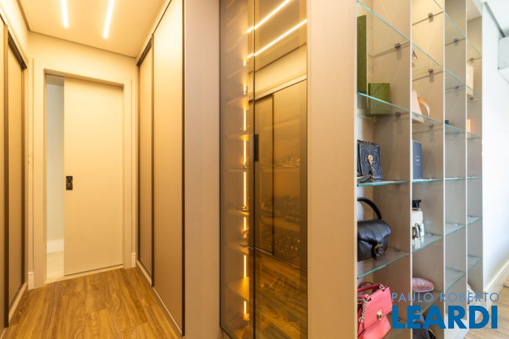 3 suítes, sendo a master com banheiro diferenciado, guarda-roupa iluminado, sapateira, penteadeira e vitrine de acessórios.