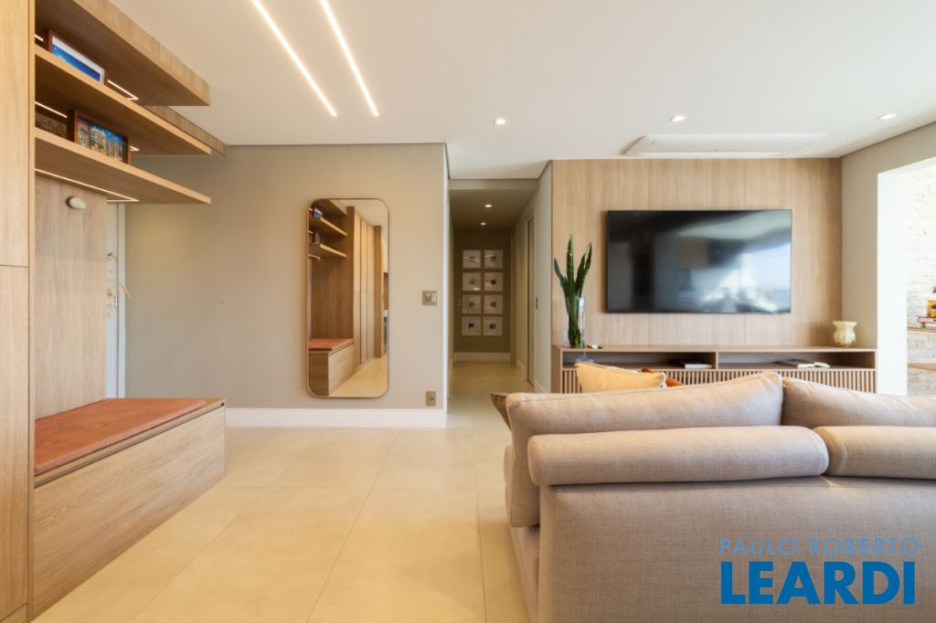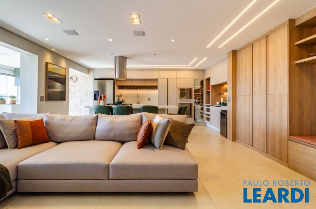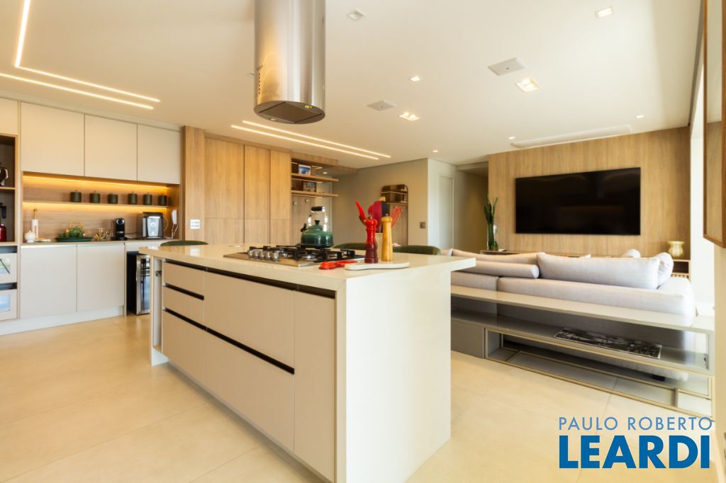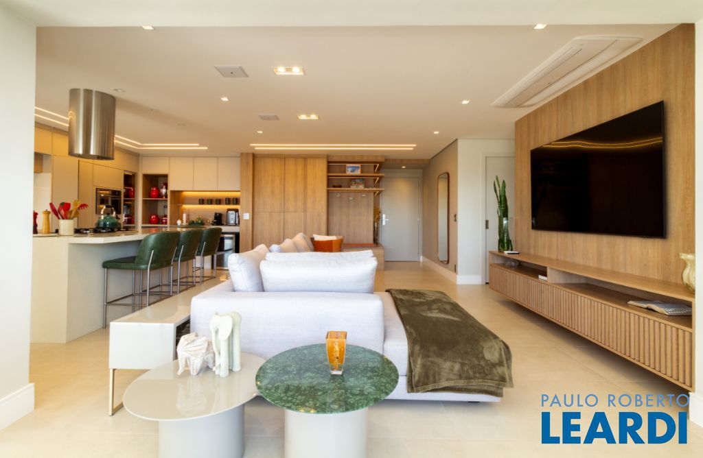 Living ampliado: sala, cozinha e varanda integrados em um espaço fluido e iluminado, com painéis de madeira, cristaleira, sapateira e espaço planejado para cervejeira e adega.