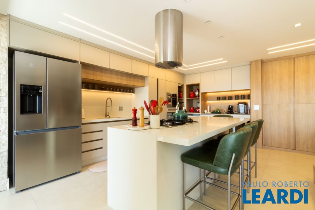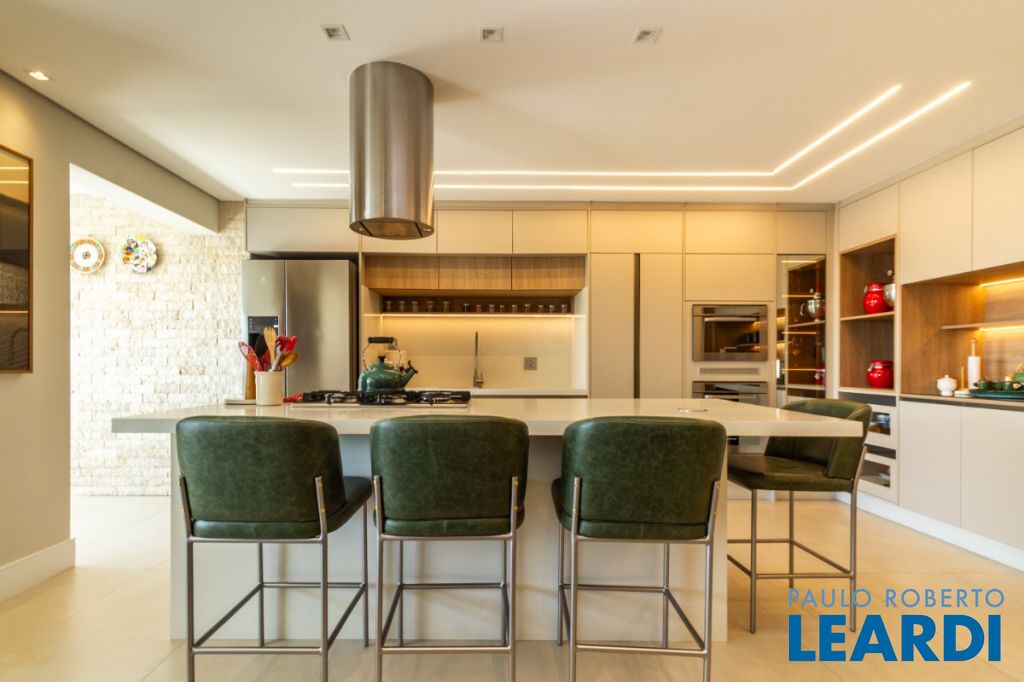 Cozinha em ilha com eletrodomésticos embutidos (coifa, forno e cooktop).
