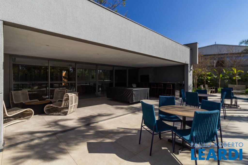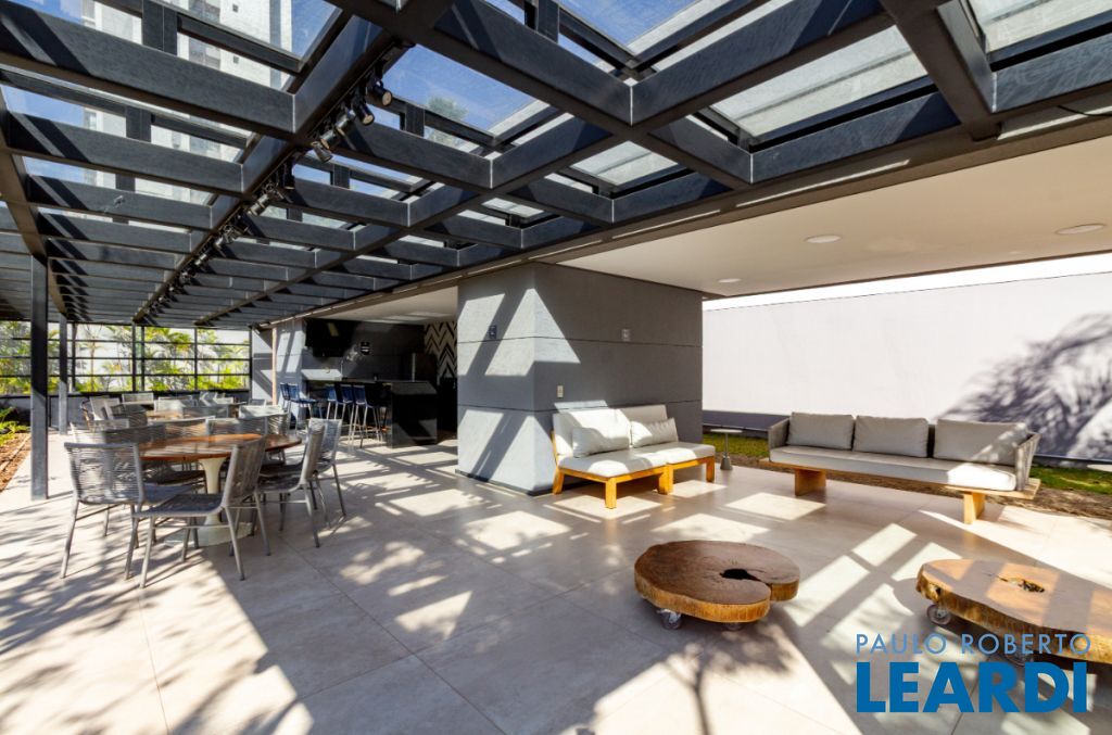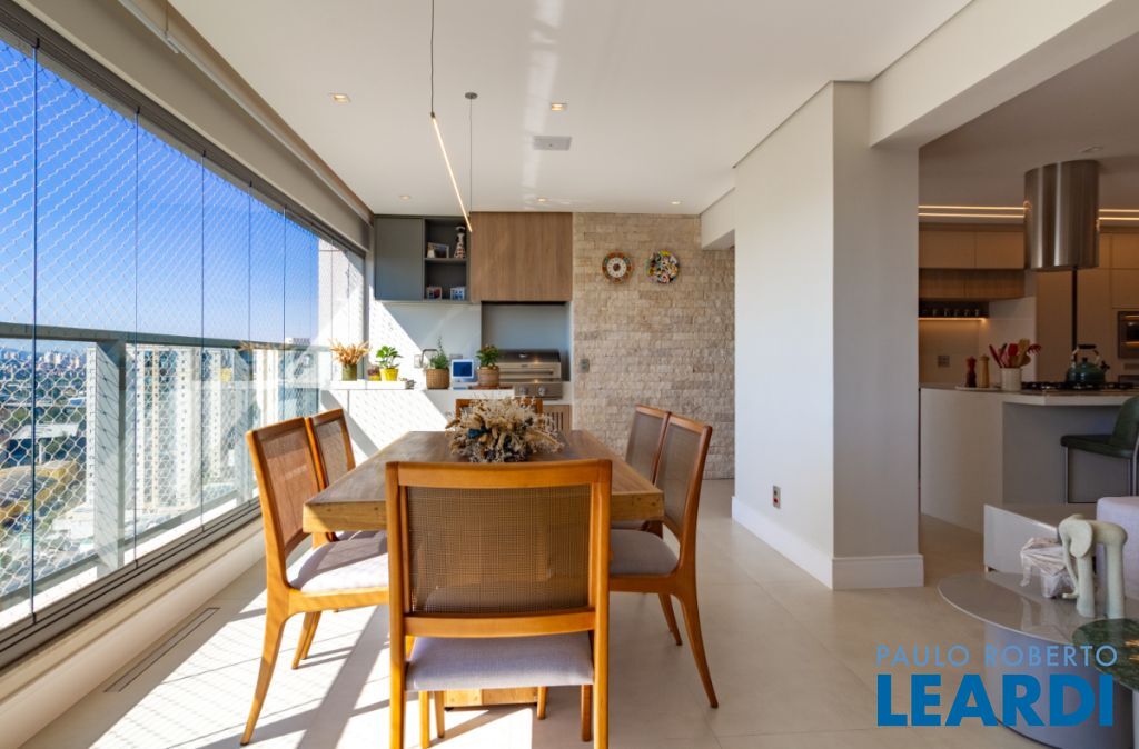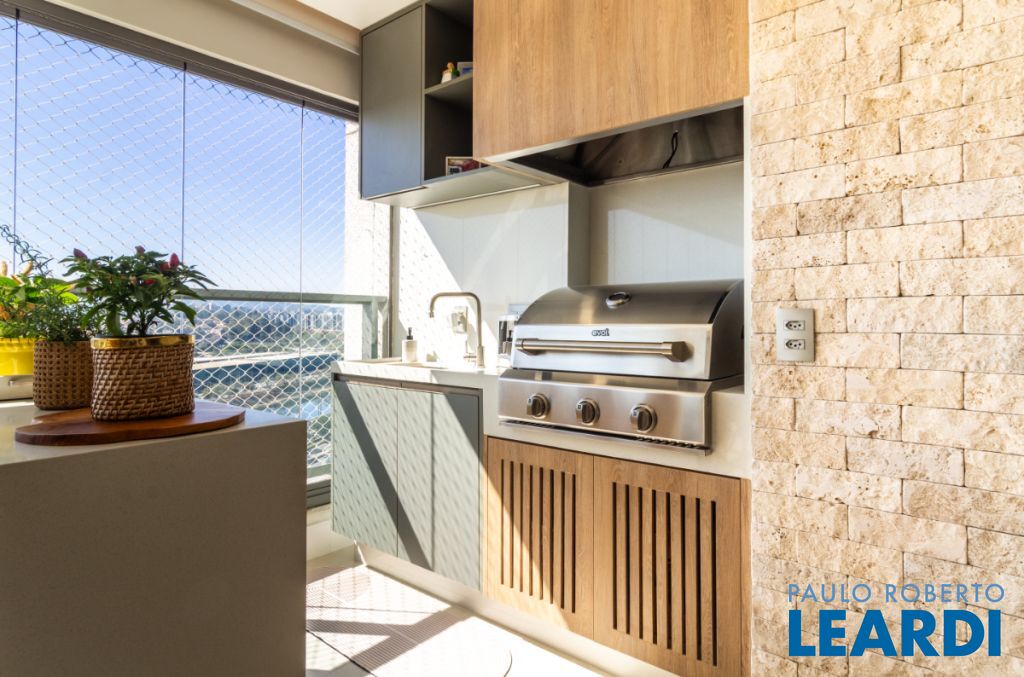 Varanda gourmet envidraçada com churrasqueira, vista livre e permanente, voltada para o norte.