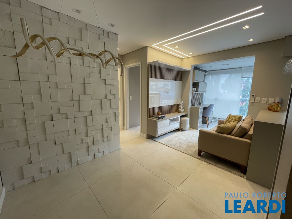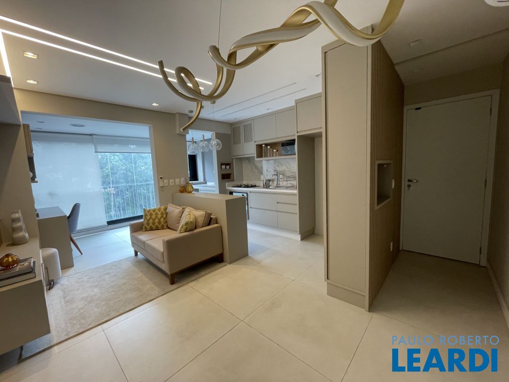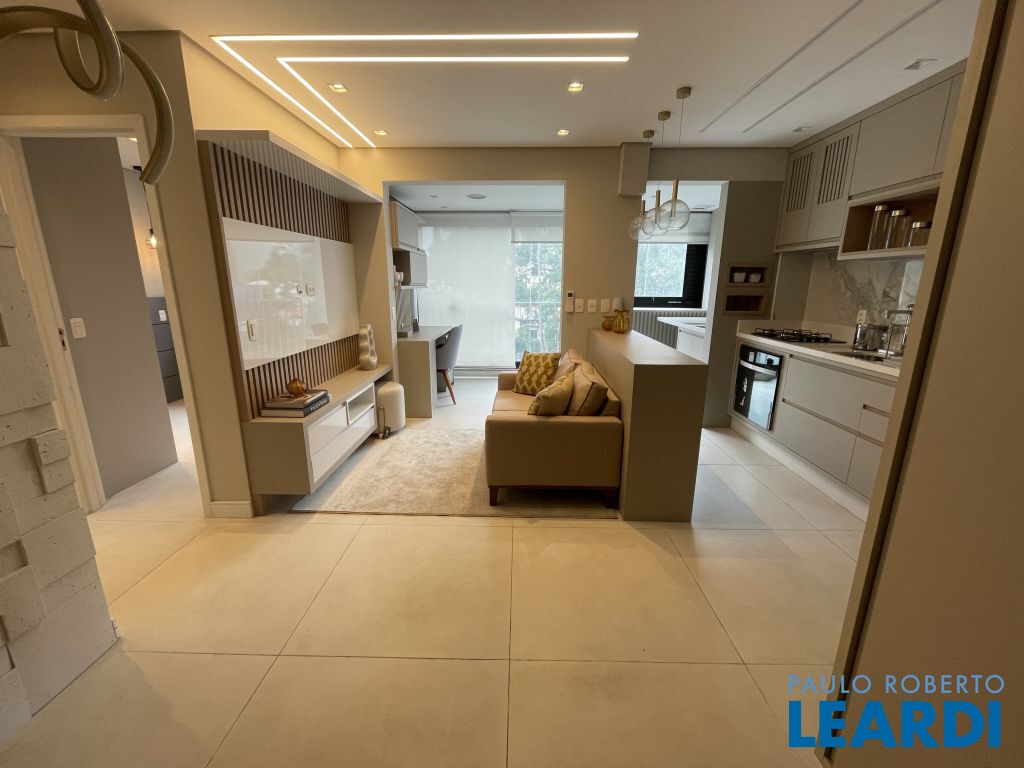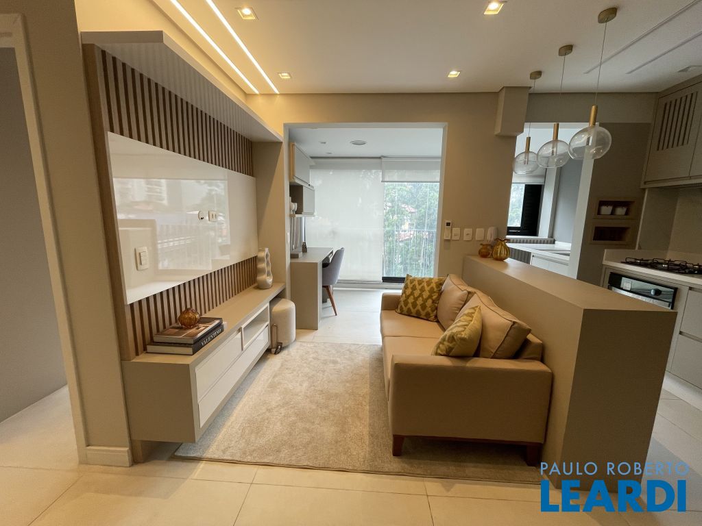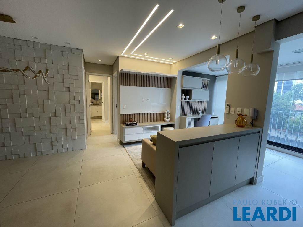 Com 59 m² bem distribuídos, o imóvel conta com 2 dormitórios, sendo 1 suíte, 2 banheiros, cozinha americana equipada, varanda integrada à sala e 1 vaga de garagem.