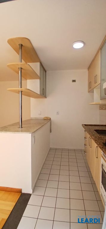 Cozinha americana com armários planejados, forno embutido e cooktop.