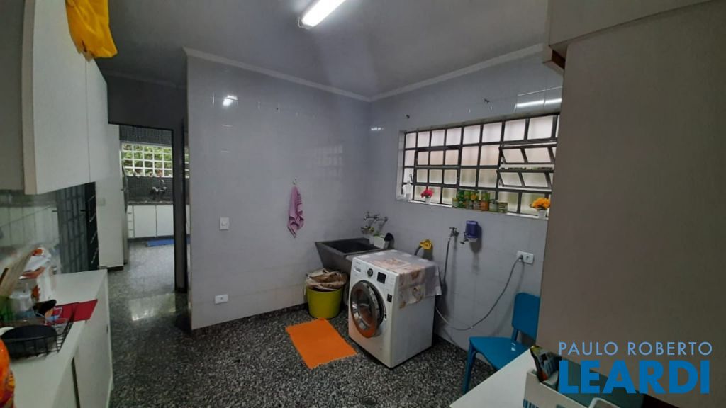 O sobrado tem uma lavanderia coberta e um depósito grande.