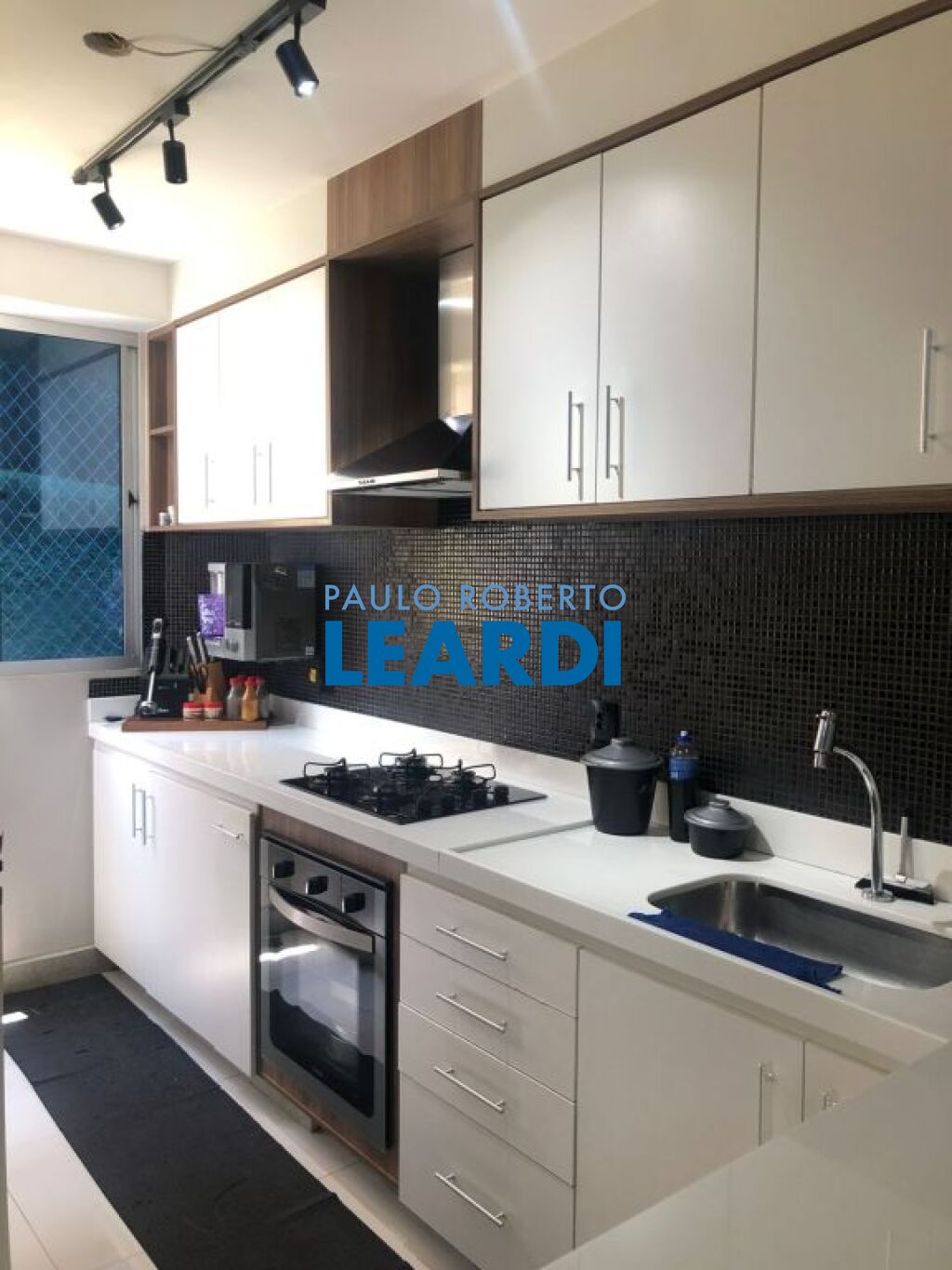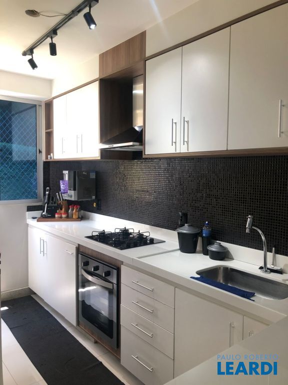Cozinha tipo americana planejada e equipada com armários, fogão e forno, bancadas em nanoglass branco, piso em prcelanato;