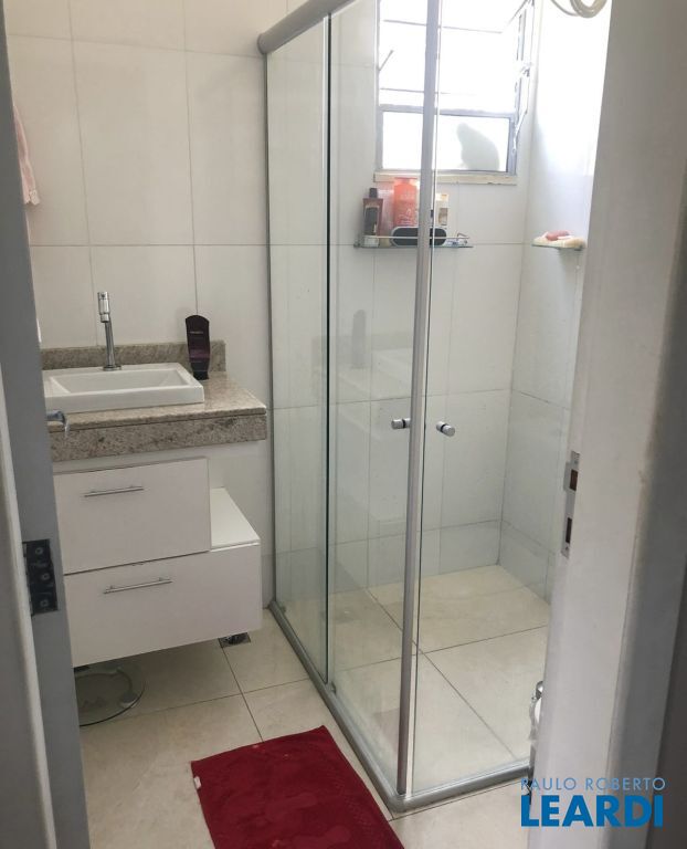 Banheiro social com bancada em granito, cuba sobrepor, box blindex;