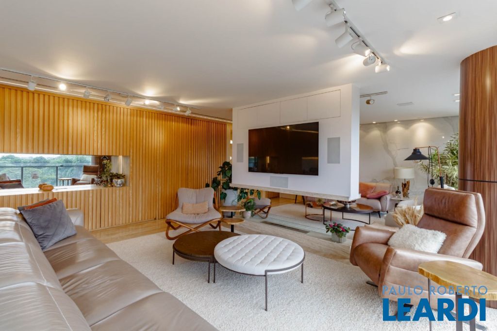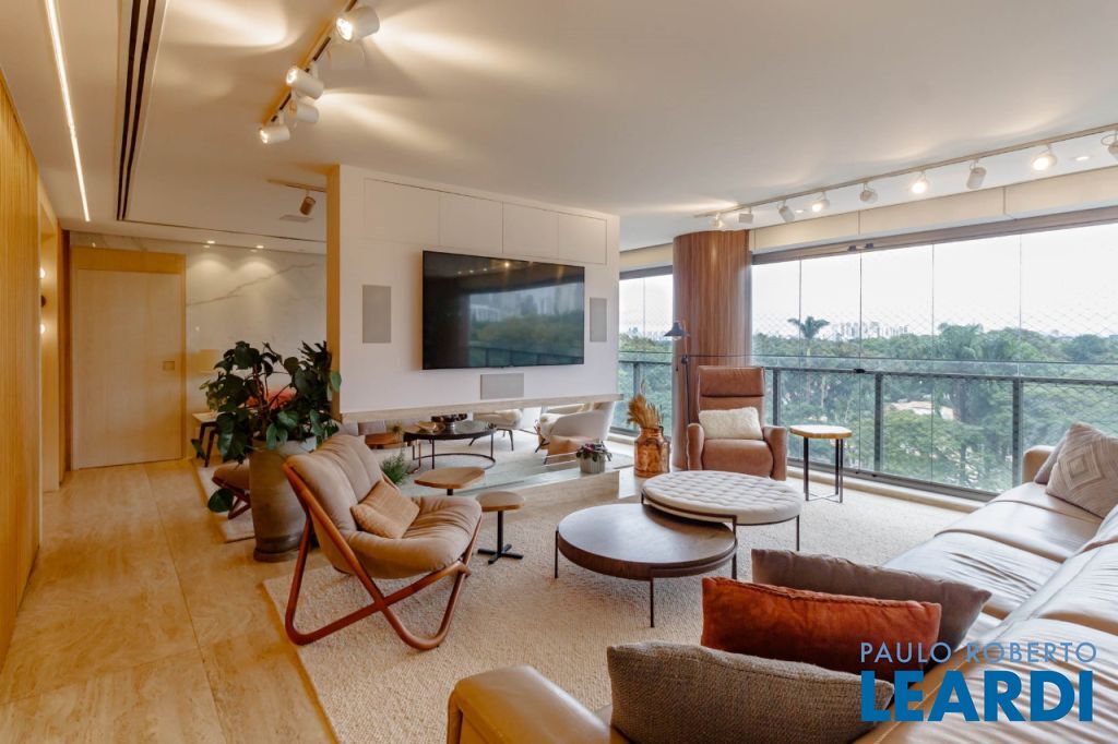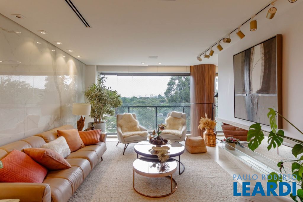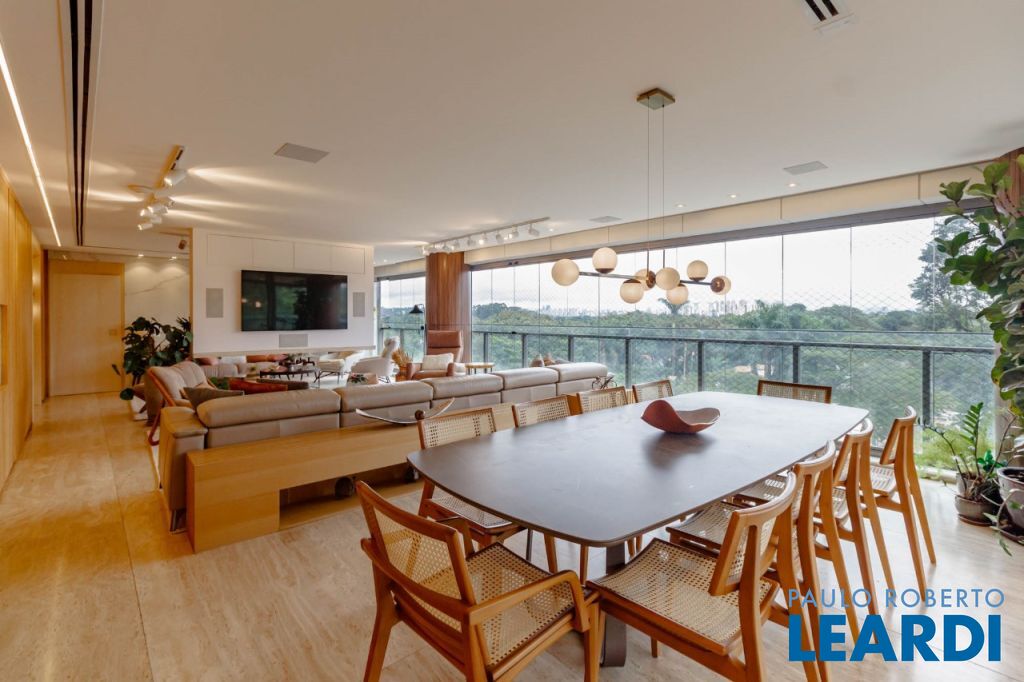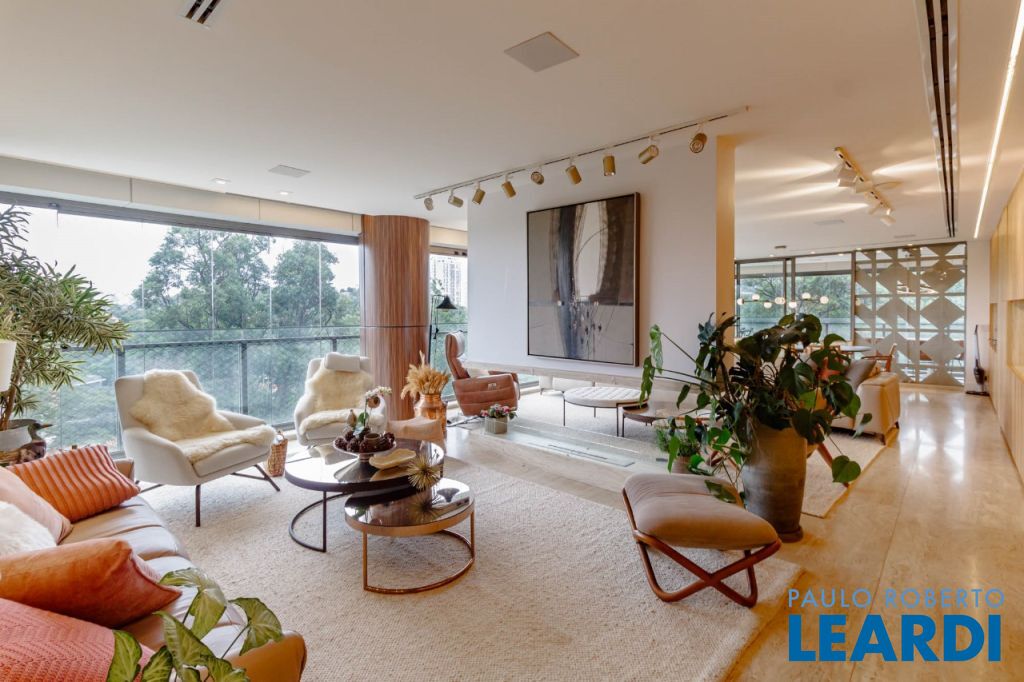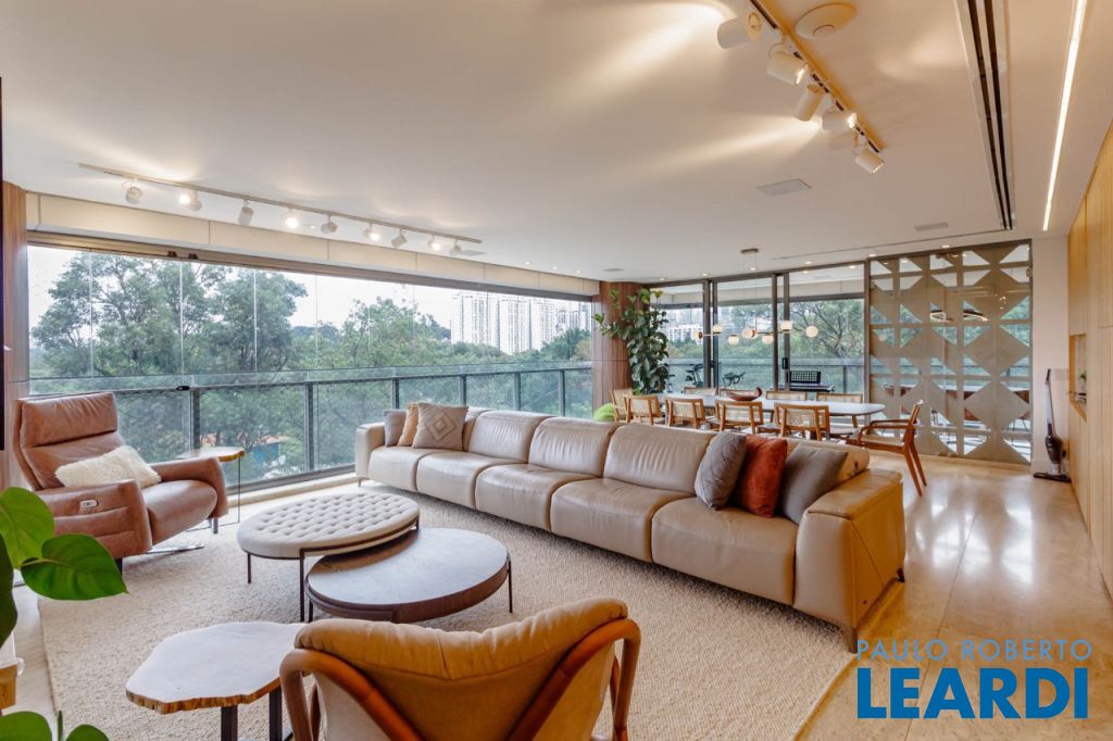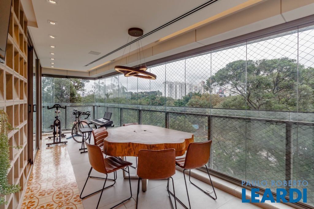 Vista livre para o verde do Alto de Pinheiros, com varanda envidraçada integrando o living e acabamento em mármore resinado.