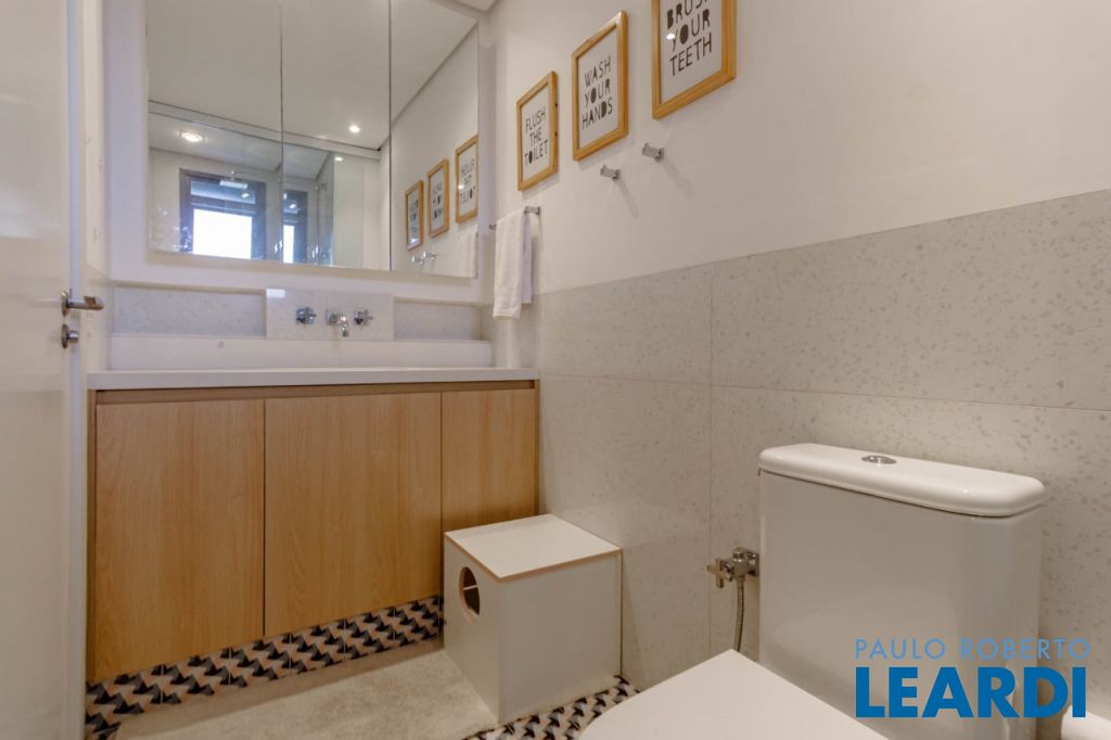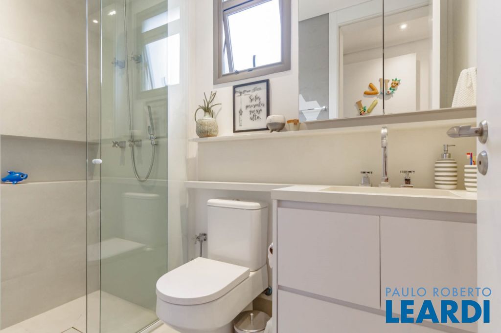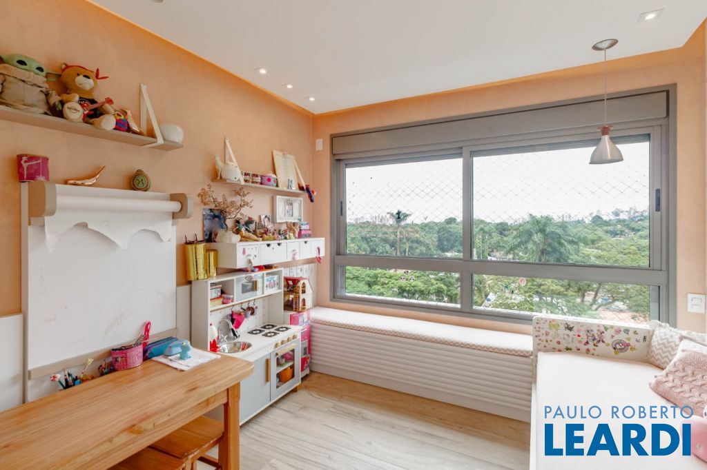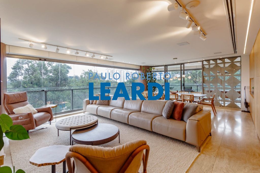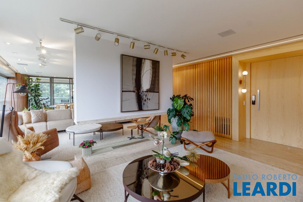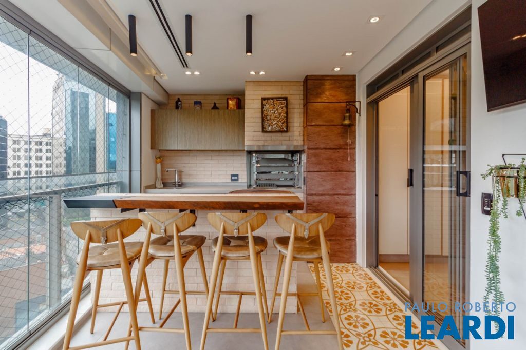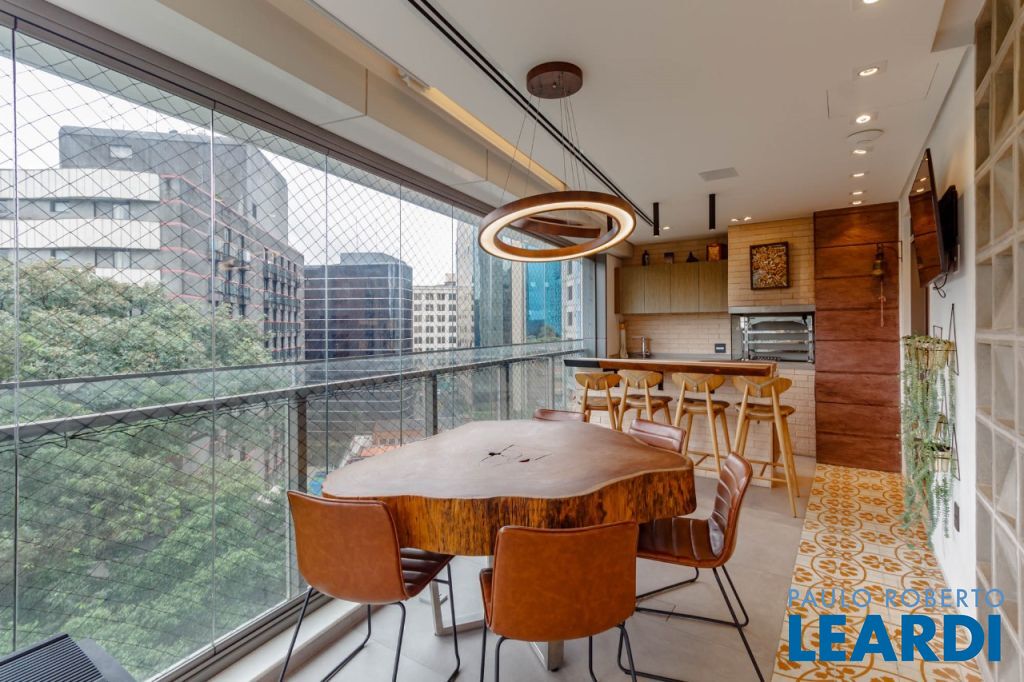 Vista livre para o verde do Alto de Pinheiros, com varanda envidraçada integrando o living e acabamento em mármore resinado.