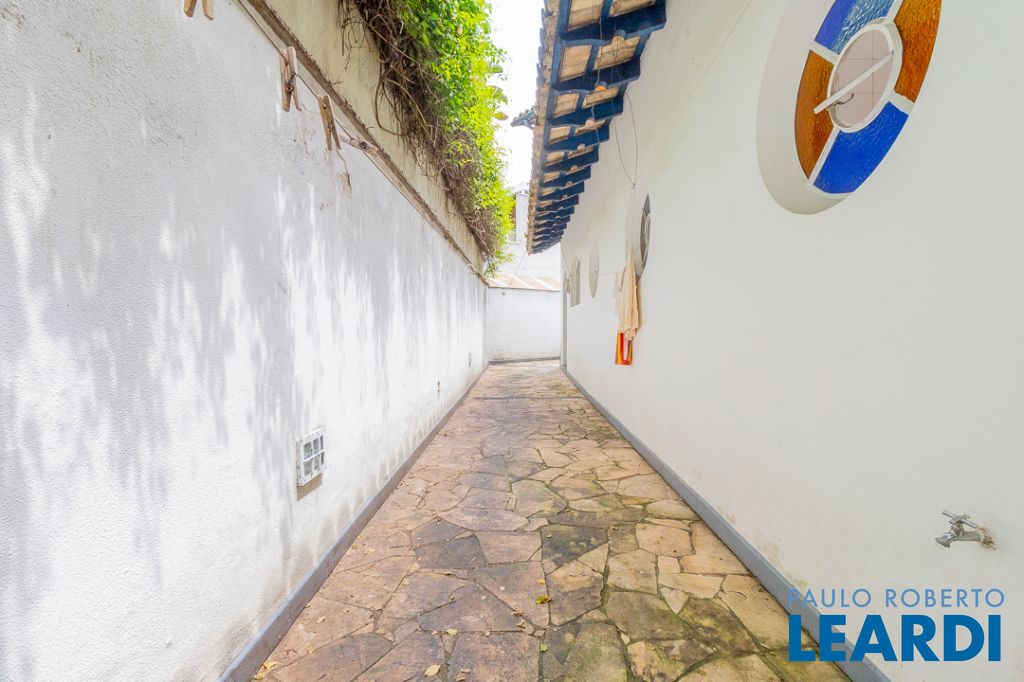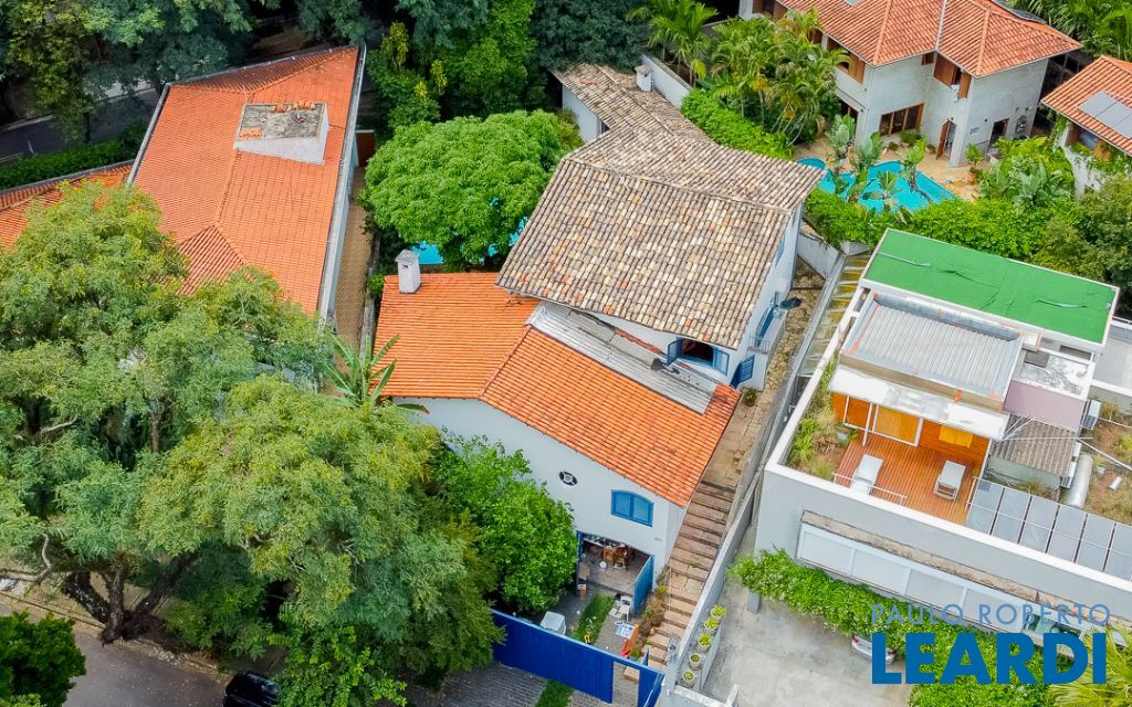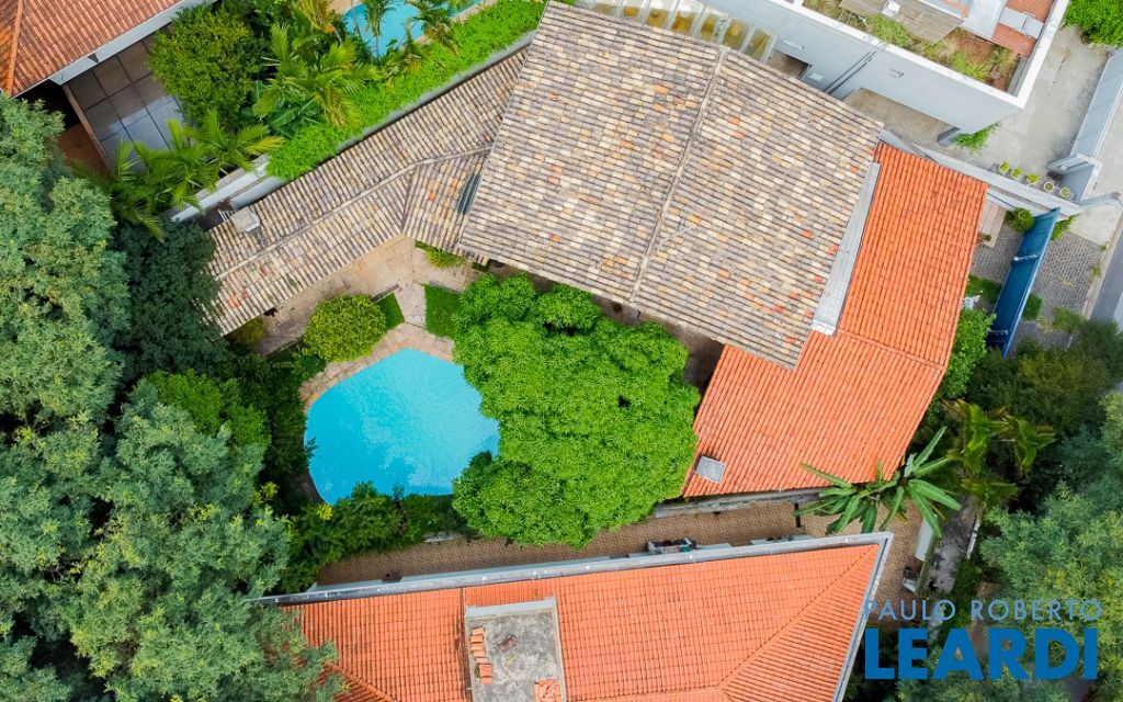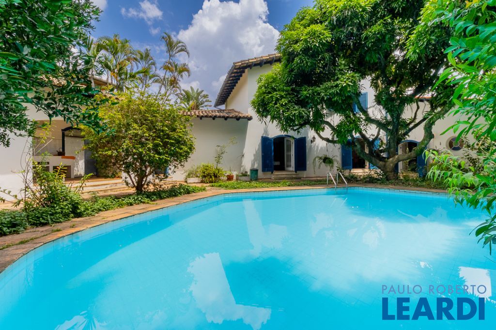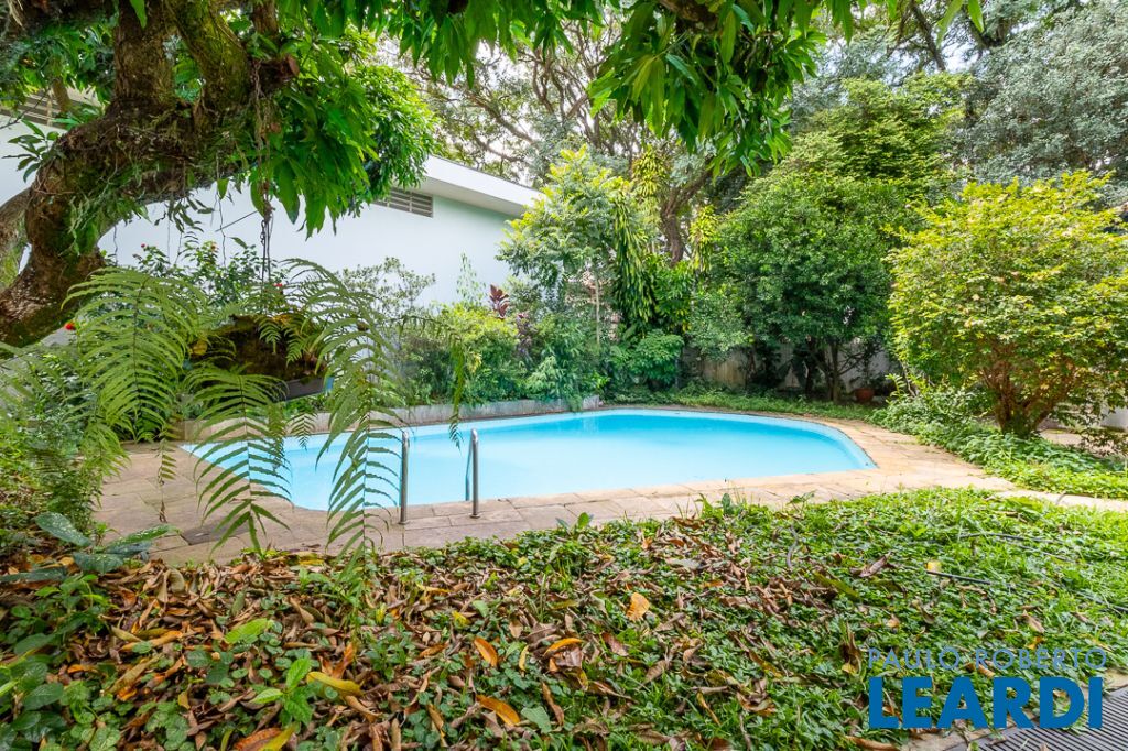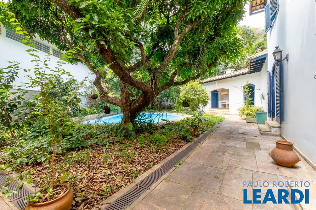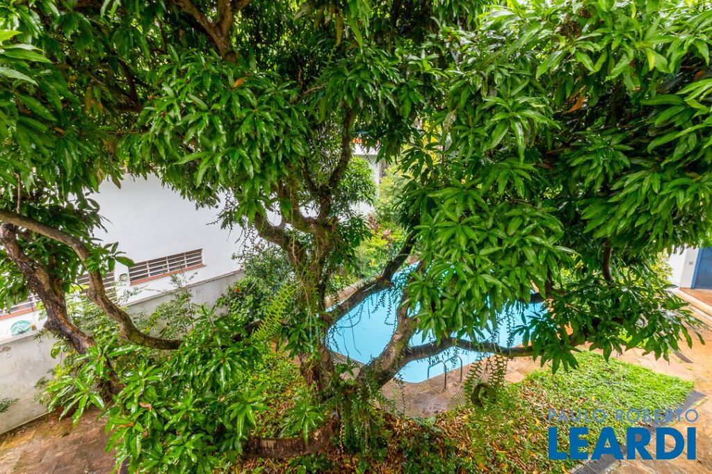 A área externa é o coração do imóvel, marcada pela presença de antigas árvores frutíferas, como um pé de manga gigante, jabuticabeira, limoeiro e amoreira, que emolduram a piscina e garantem sombra natural. A estrutura de lazer se complementa por uma chu2604