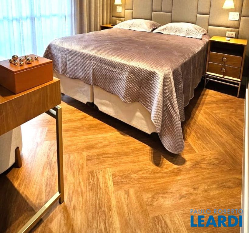 Piso frio nas salas e tacos de madeira nas suítes.
