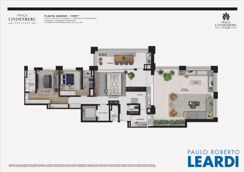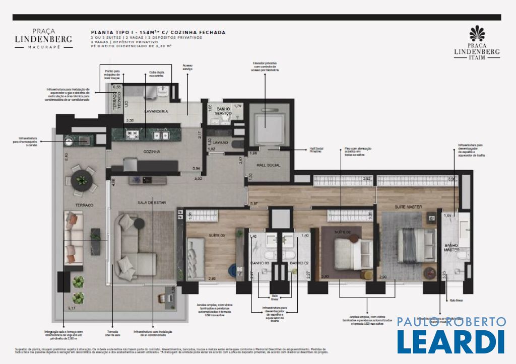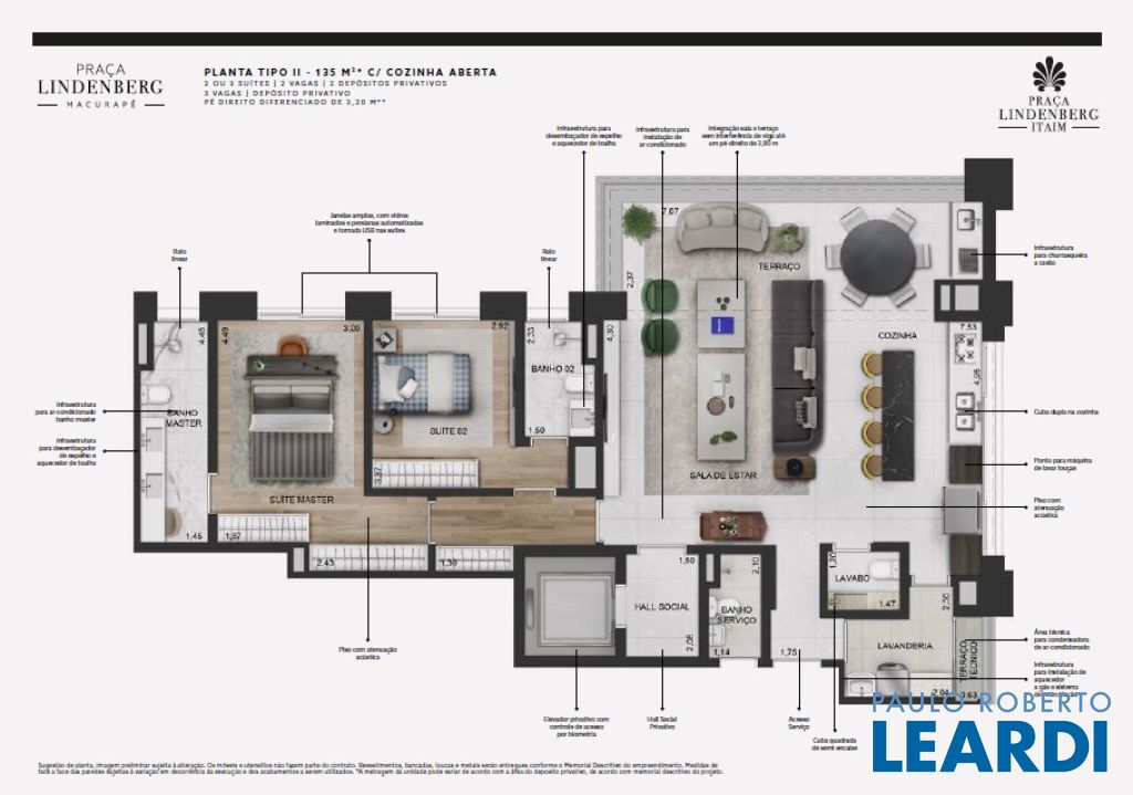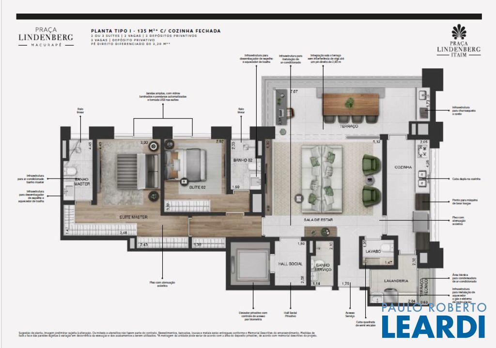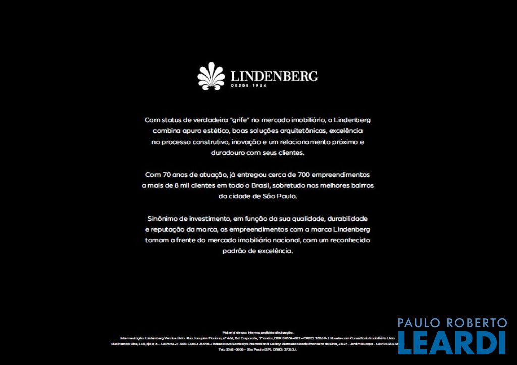 Praça Lindenberg Itaim: O Novo Dulce Lar de Alto Padrão Endereço: Rua Macurapé, 43 - Itaim Bibi, São Paulo - SP, 04537-060 Área do Terreno: 2.685,15 m² Torre Única: 118 Unidades (112 unidades-tipo, 4 Gardens, 2 Penthouses) Se a sua visão de lar combina comodidade, sofisticação e um ambiente urbano vibrante, o Praça Lindenberg Itaim é uma escolha inigualável. Localizado em uma das áreas mais desejadas de São Paulo, entre os icônicos parques Ibirapuera e do Povo, este condomínio se destaca não apenas pela localização, mas pela qualidade e inovação que oferece. Características Técnicas do Empreendimento: Tipologias de Apartamentos: Tipo 1 (finais 2 e 3): Área: a partir de 135 m² Suítes: 2 Vagas: 1 a 2 Tipo 2 (finais 1 e 4): Área: a partir de 154 m² Suítes: 2 ou 3 Vagas: 2 Units Menores (6º e 29º pav.): Área: 142,32 m² a 143,42 m² ou 168,19 m² a 172,60 m² Gardens: Área: 195 m² a 348 m² Suítes: 2 ou 3 Vagas: 2 Penthouse: Área: 314 m² Suítes: 3 Vagas: 3 Vagas e Depósitos: Vagas: 236, garantidas para todos os residentes. Depósito Privatizado: 2 por unidade (1 no andar e 1 no subsolo). Estrutura e Áreas Comuns: O Praça Lindenberg Itaim não só apresenta apartamentos de diversas metragens e configurações, mas também proporciona um estilo de vida único através de suas áreas comuns, que incluem: Salão de festas gourmet e apoio para festas externas. Fitness, Espaço Kids e Playground. Piscina com raia de 25 m e Piscina infantil. Central delivery para maior praticidade.0404