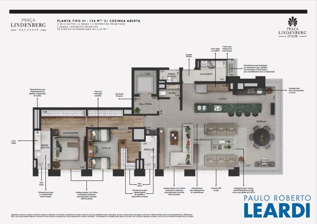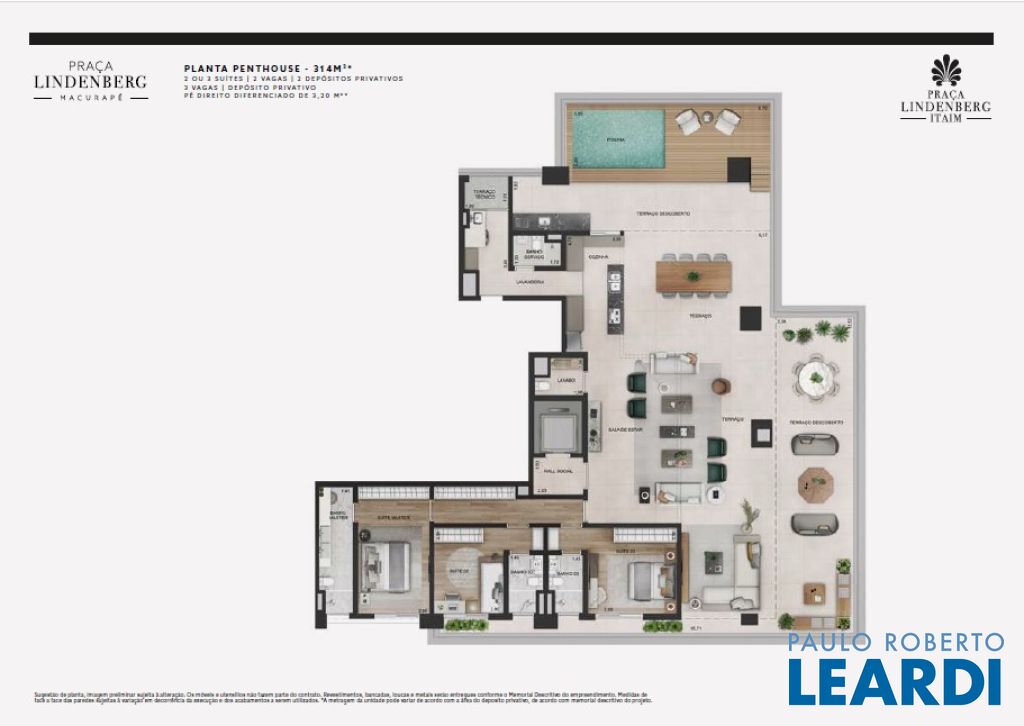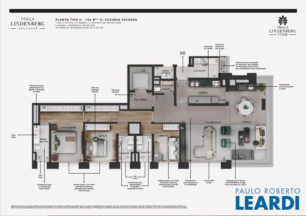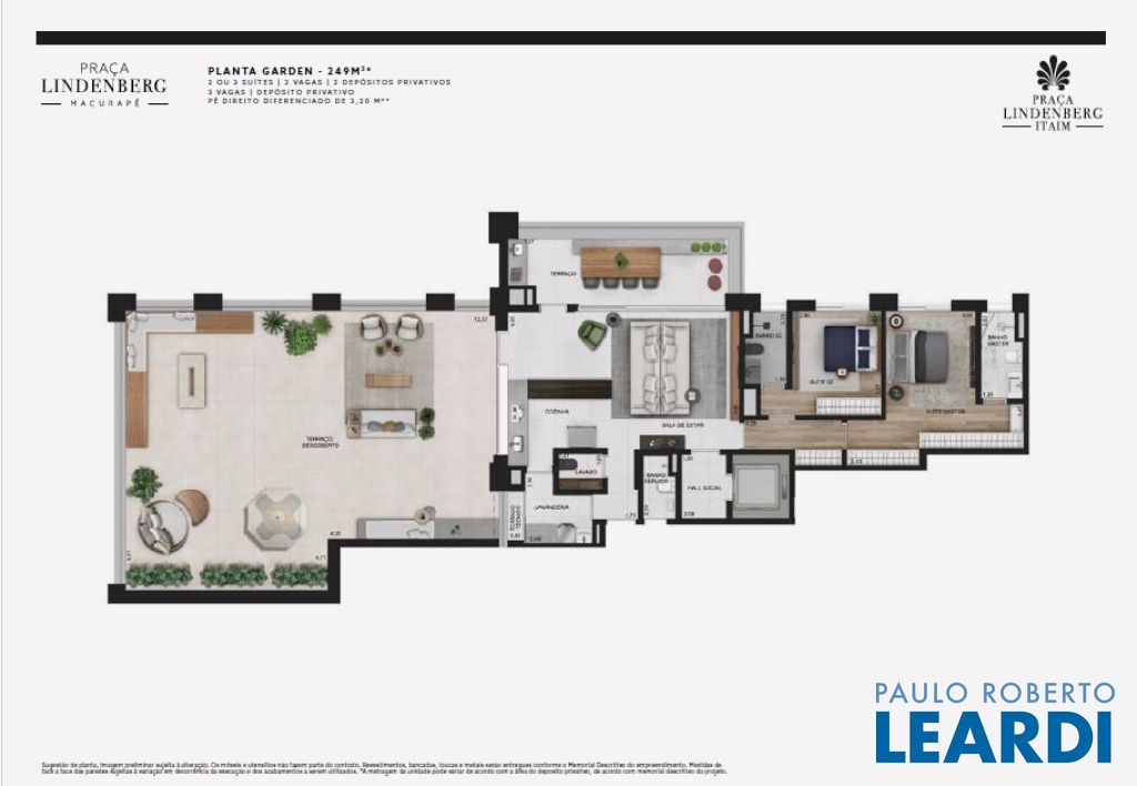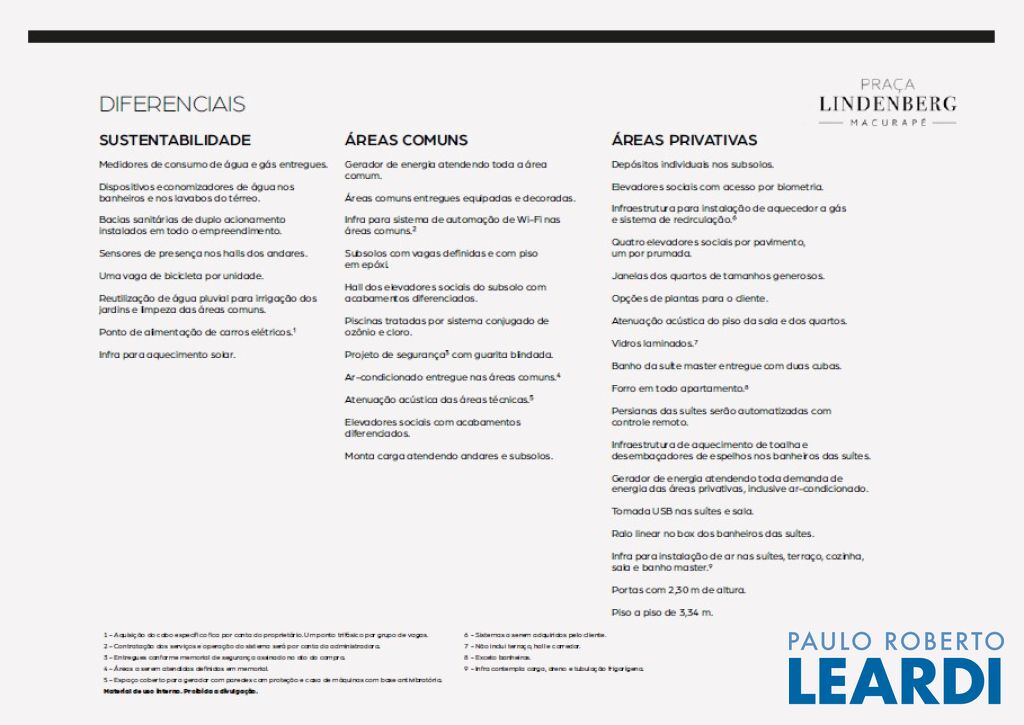 Praça Lindenberg Itaim: O Novo Dulce Lar de Alto Padrão Endereço: Rua Macurapé, 43 - Itaim Bibi, São Paulo - SP, 04537-060 Área do Terreno: 2.685,15 m² Torre Única: 118 Unidades (112 unidades-tipo, 4 Gardens, 2 Penthouses) Se a sua visão de lar combina comodidade, sofisticação e um ambiente urbano vibrante, o Praça Lindenberg Itaim é uma escolha inigualável. Localizado em uma das áreas mais desejadas de São Paulo, entre os icônicos parques Ibirapuera e do Povo, este condomínio se destaca não apenas pela localização, mas pela qualidade e inovação que oferece. Características Técnicas do Empreendimento: Tipologias de Apartamentos: Tipo 1 (finais 2 e 3): Área: a partir de 135 m² Suítes: 2 Vagas: 1 a 2 Tipo 2 (finais 1 e 4): Área: a partir de 154 m² Suítes: 2 ou 3 Vagas: 2 Units Menores (6º e 29º pav.): Área: 142,32 m² a 143,42 m² ou 168,19 m² a 172,60 m² Gardens: Área: 195 m² a 348 m² Suítes: 2 ou 3 Vagas: 2 Penthouse: Área: 314 m² Suítes: 3 Vagas: 3 Vagas e Depósitos: Vagas: 236, garantidas para todos os residentes. Depósito Privatizado: 2 por unidade (1 no andar e 1 no subsolo). Estrutura e Áreas Comuns: O Praça Lindenberg Itaim não só apresenta apartamentos de diversas metragens e configurações, mas também proporciona um estilo de vida único através de suas áreas comuns, que incluem: Salão de festas gourmet e apoio para festas externas. Fitness, Espaço Kids e Playground. Piscina com raia de 25 m e Piscina infantil. Central delivery para maior praticidade.0404