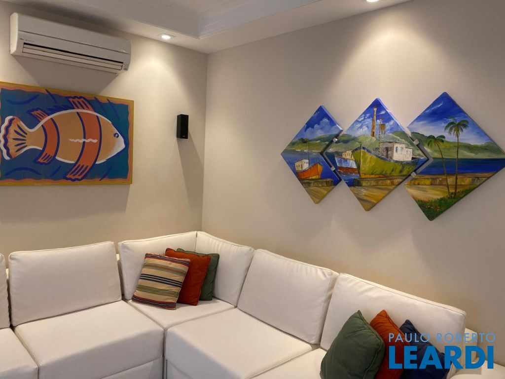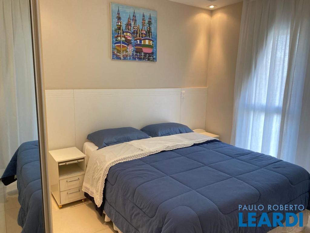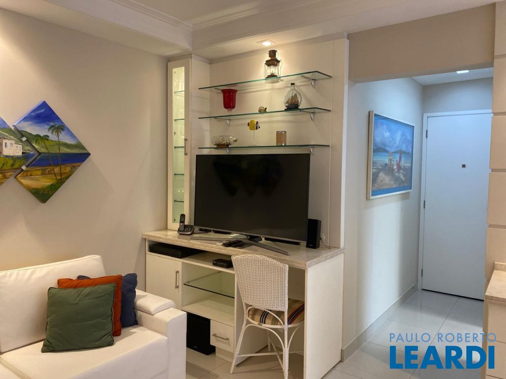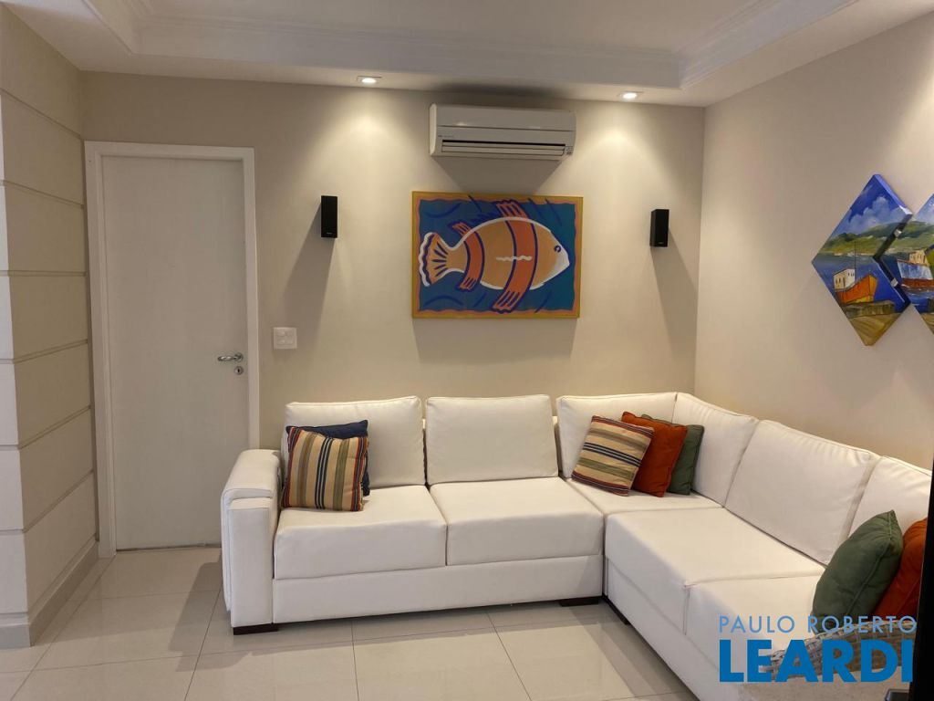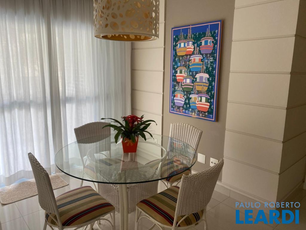 Imóvel moderno e clean com 85 M2, sala de jantar, uma suíte e dois quartos, banheiro, piso Portobello, varandas, decoração e quadros náuticos.