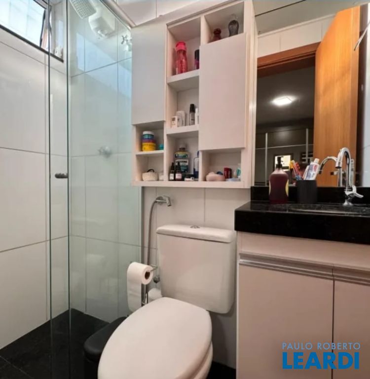 Banheiros com armários, box e espelhos.