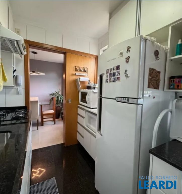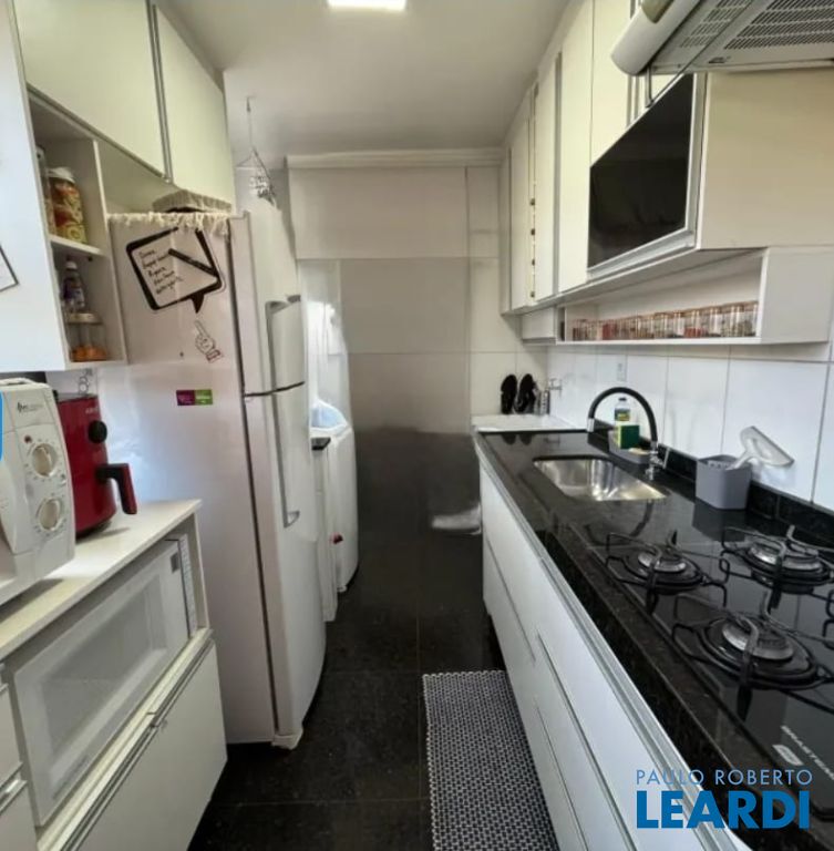 Cozinha com armários planejados e área de serviço separada.