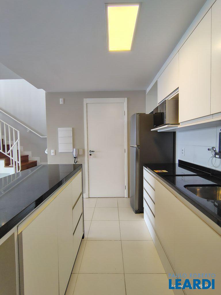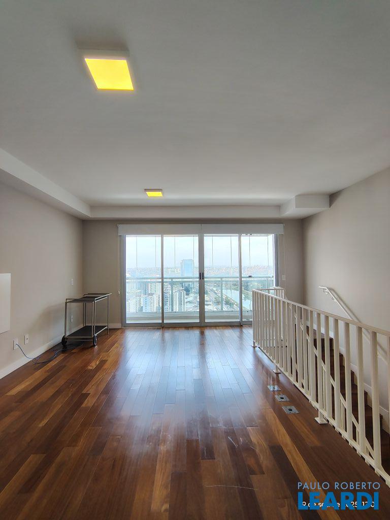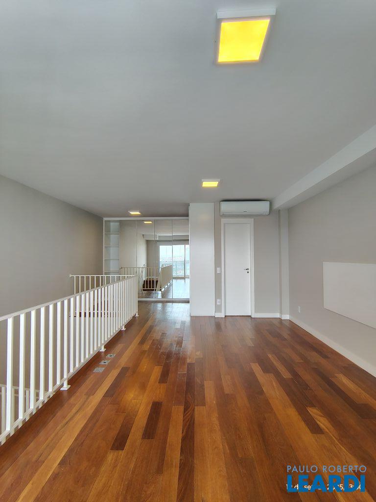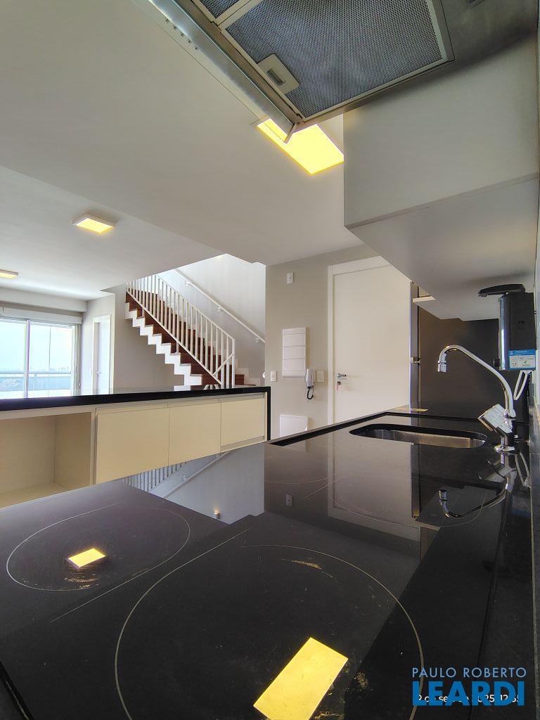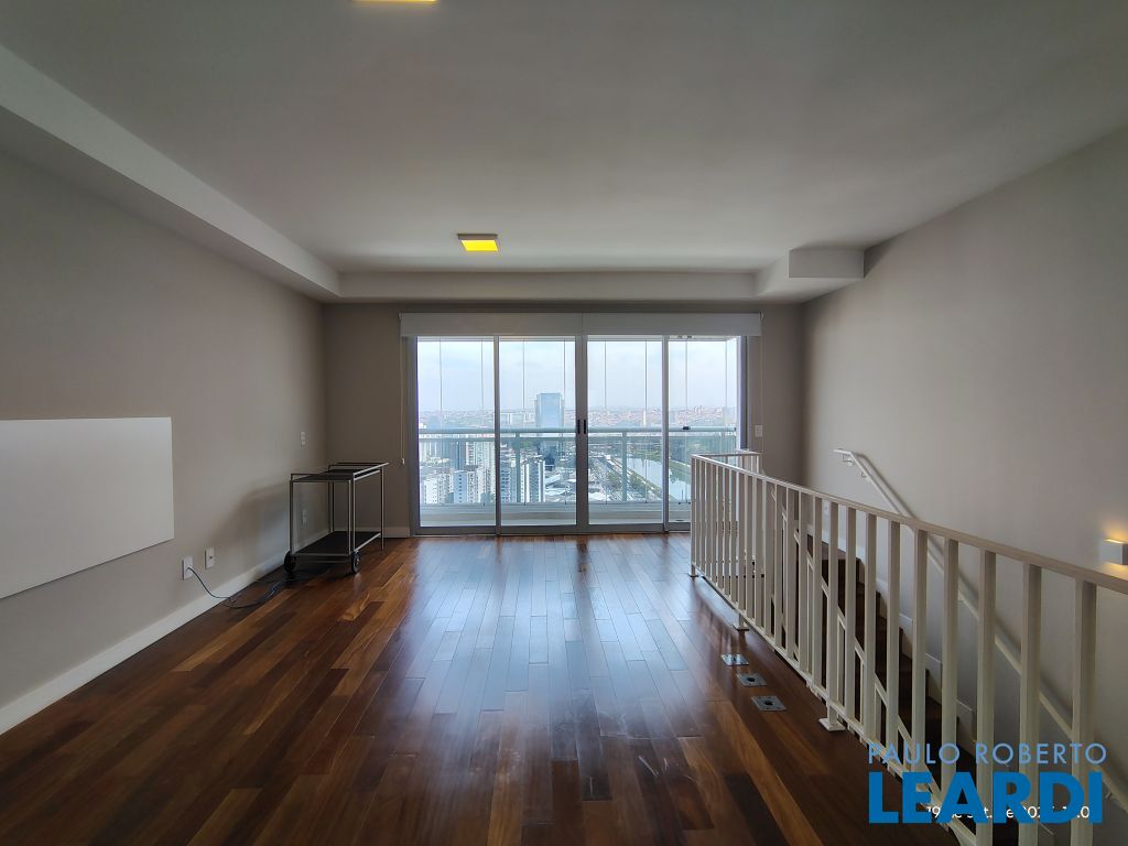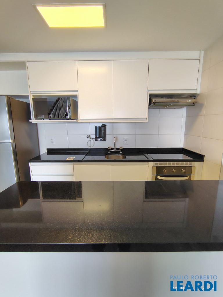 Studio Duplex Mobiliado com Ar-condicionado, 1 suíte + Lavabo, Varanda fechada com vidro, Cozinha americana com Geladeira, Micro ondas, Cooktop e Forno, área de serviço e 2 vagas de garagem. Vista livre permanente.