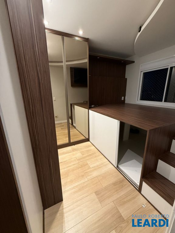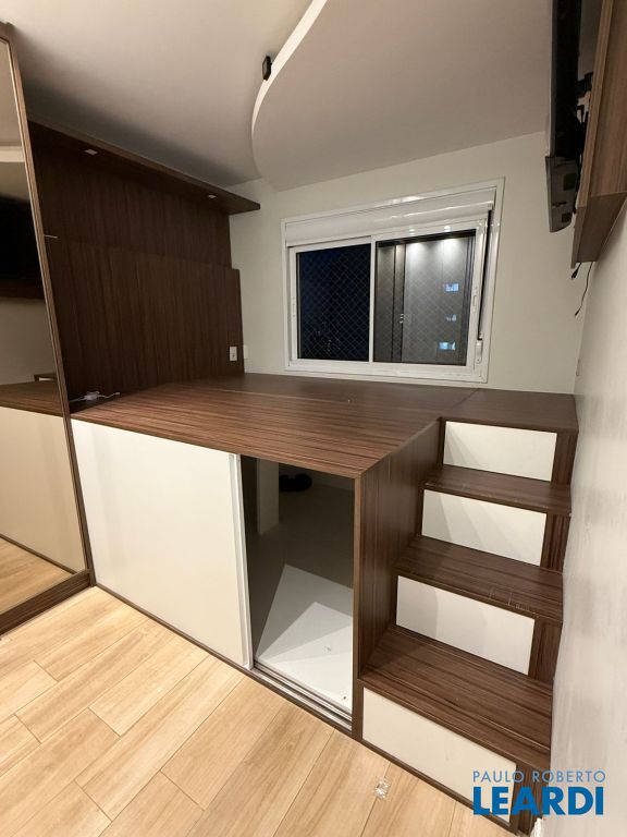 Um dos dormitórios dispõe de cama de casal suspensa, com espaço inferior para armazenamento de malas e objetos, otimizando a área útil.