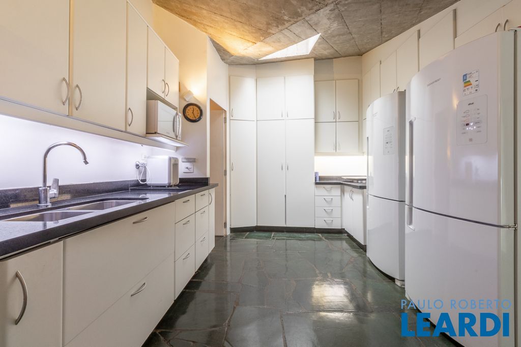 A sala de jantar, em outro plano, conecta-se de forma fluida à copa e à cozinha totalmente equipada, integrando-se à área de serviço, lavanderia, depósitos e à suíte de funcionários. A planta funcional privilegia circulação e privacidade, com múltiplos espaços de apoio e armazenamento.2201