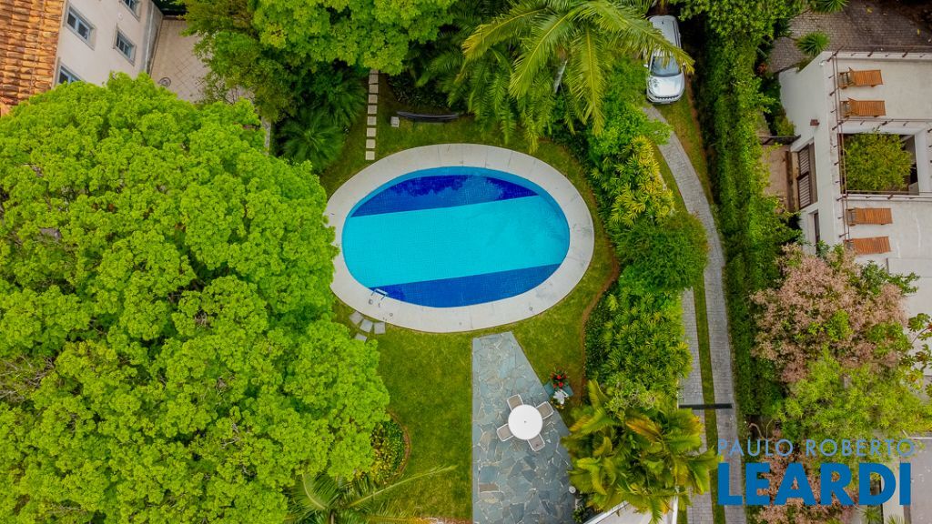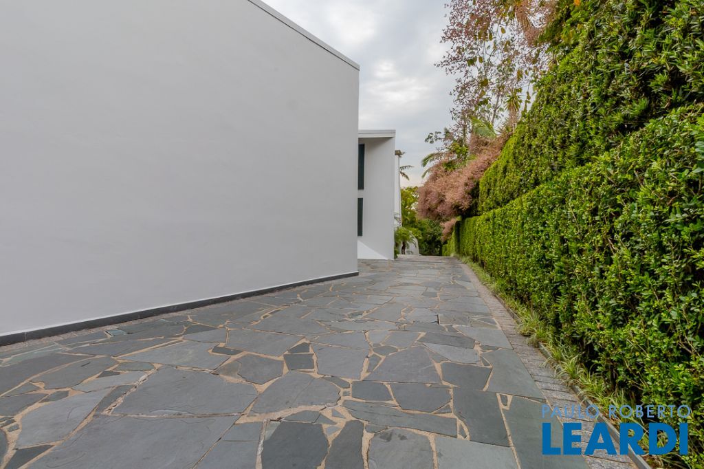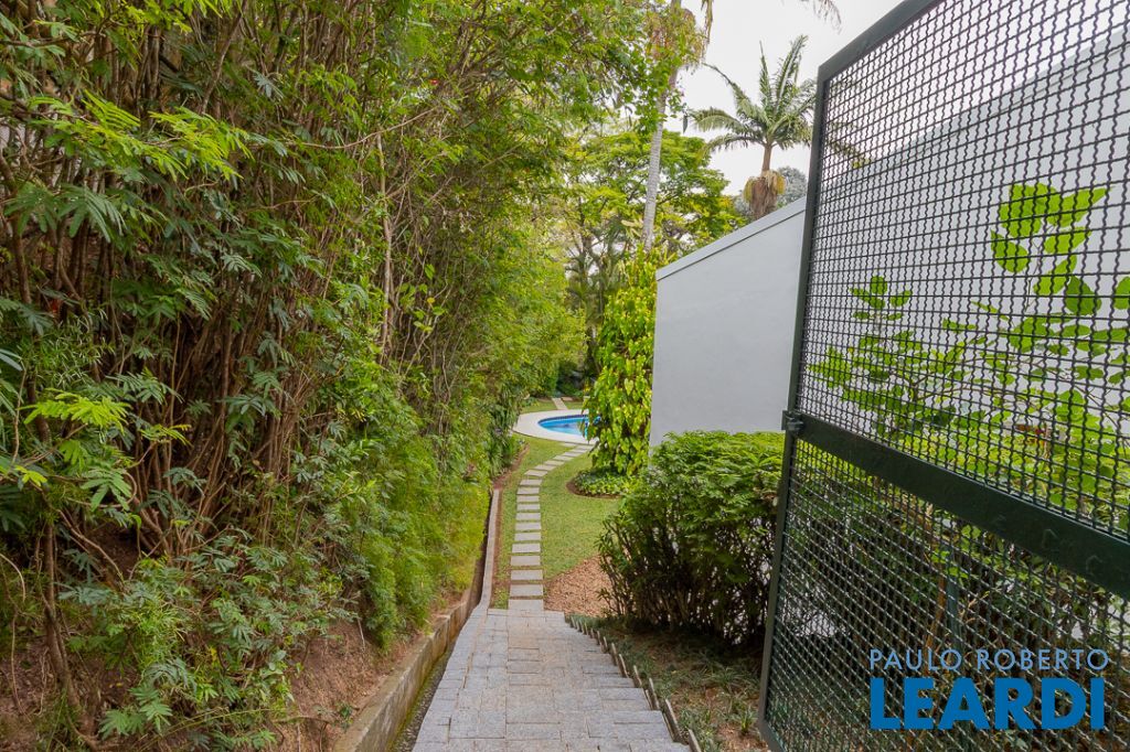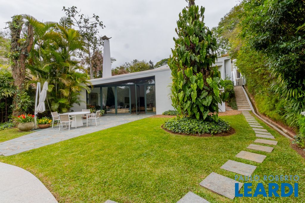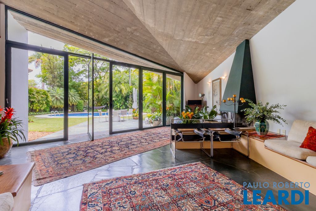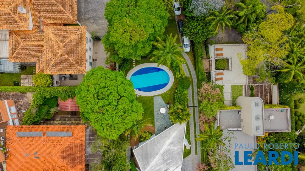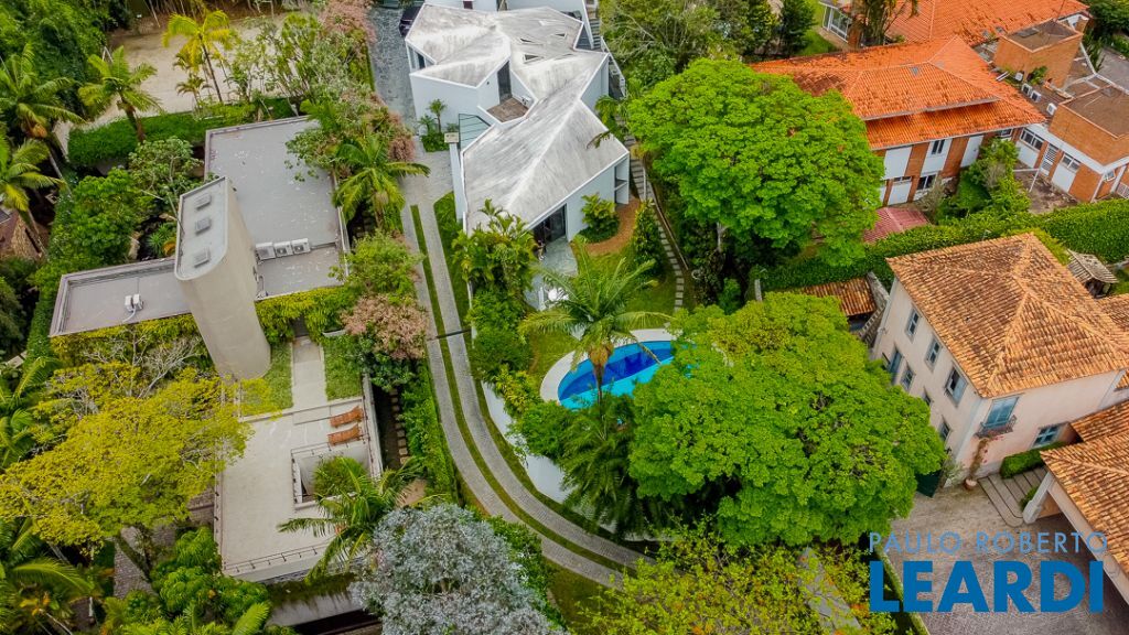 Implantada em um terreno privilegiado de 1.550 m², com 422 m² de área construída, a casa se integra de maneira orgânica ao entorno. O projeto paisagístico, assinado e cuidadosamente executado, faz da área externa uma continuação poética dos interiores: jardins desenhados por sucessões de níveis, maciços floridos e caminhos que revelam cenários, onde as congéias merecem destaque árvores que pontuam o jardim com flores vibrantes e textura, criando enquadramentos naturais que variam conforme as estações. A piscina, estrategicamente posicionada, reflete o céu pelas claraboias e pelos recortes geométricos dos tetos, enquanto o verde circunda todos os ângulos da casa.