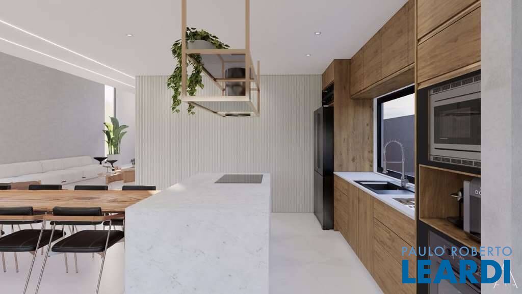 Cozinha planejada com bancada, ilha, balcão, armários, gabinetes, 2 cubas inox e torneira gourmet.