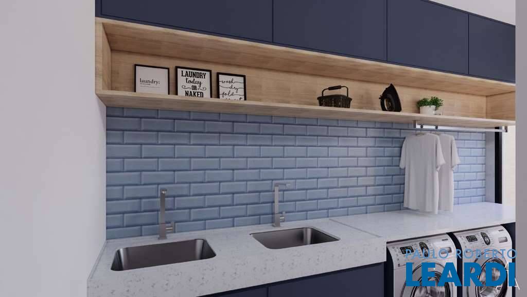 Área de serviço aberta ensolarada e lavanderia fechada com tanque e dependências de serviço.