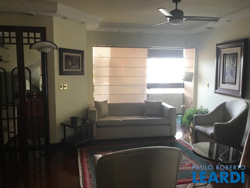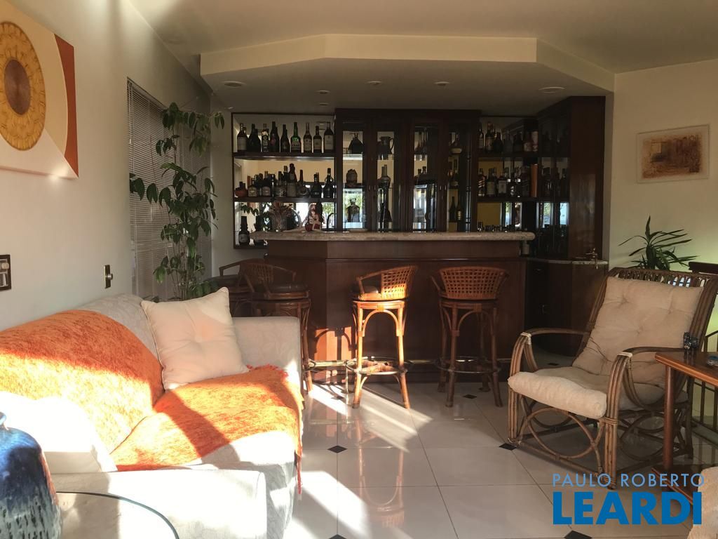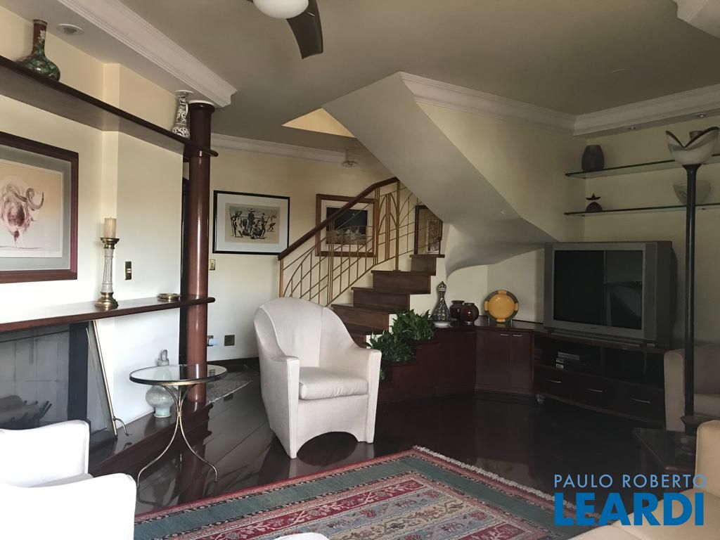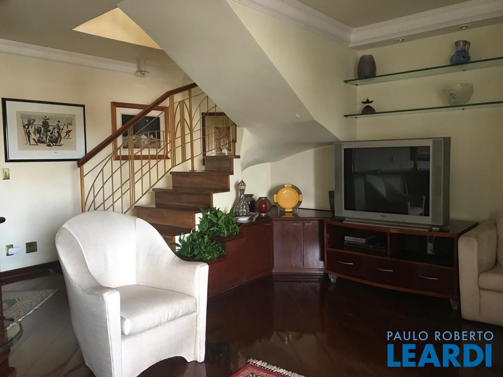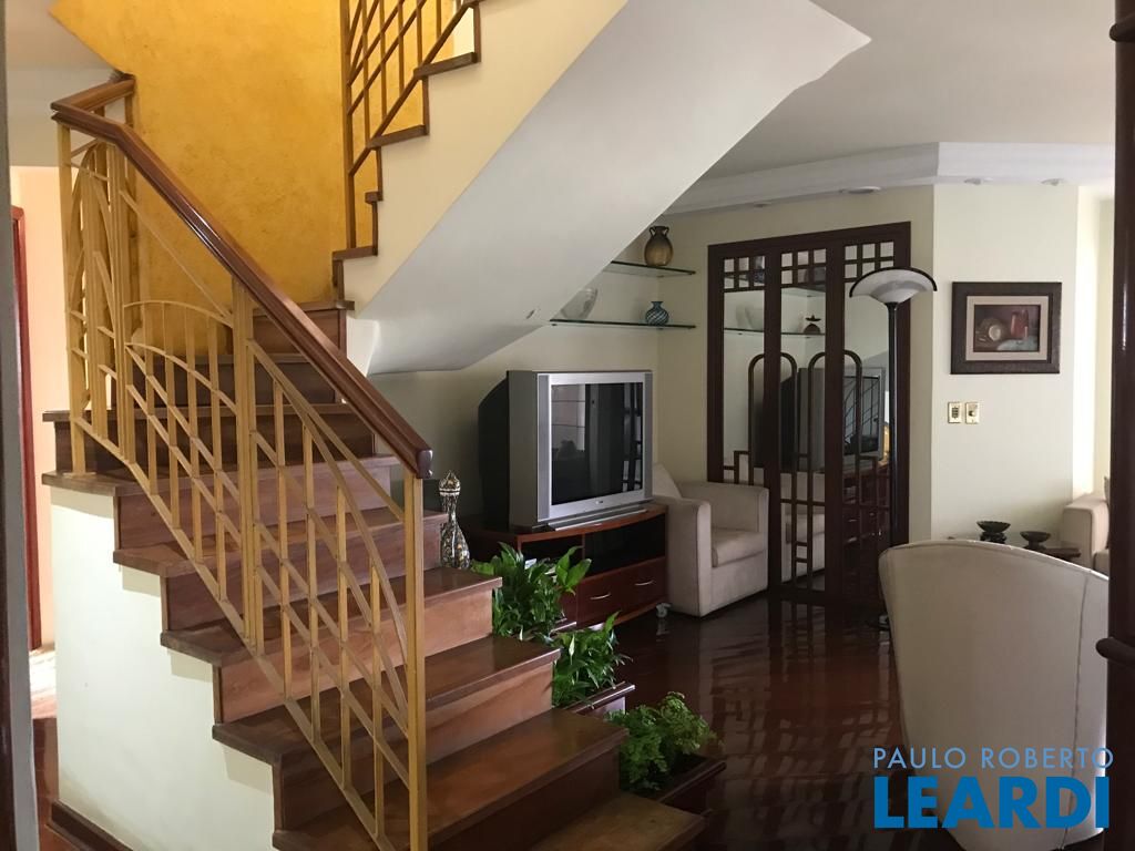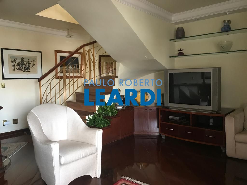 No andar de baixo, sala de estar com varanda, sala de jantar, lavabo, 3 dormitórios sendo uma suíte com closet e varanda, e um dos dormitórios serve como closet, repleto de armários. Cozinha espaçosa também repleta de armários, boa área de serviço com dependência completa de empregada. No andar de cima, piscina, sauna, ducha, churrasqueira, bar e sala íntima, além de uma pequena horta, mini cozinha e lavabo.