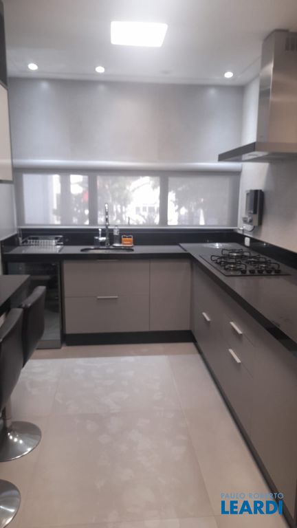Cozinha planejada repleta de armários e com equipamentos com cook top , coifa , forno elétrico , micro-ondas .