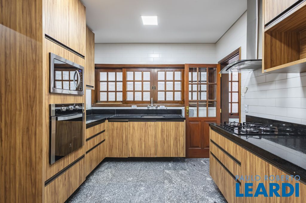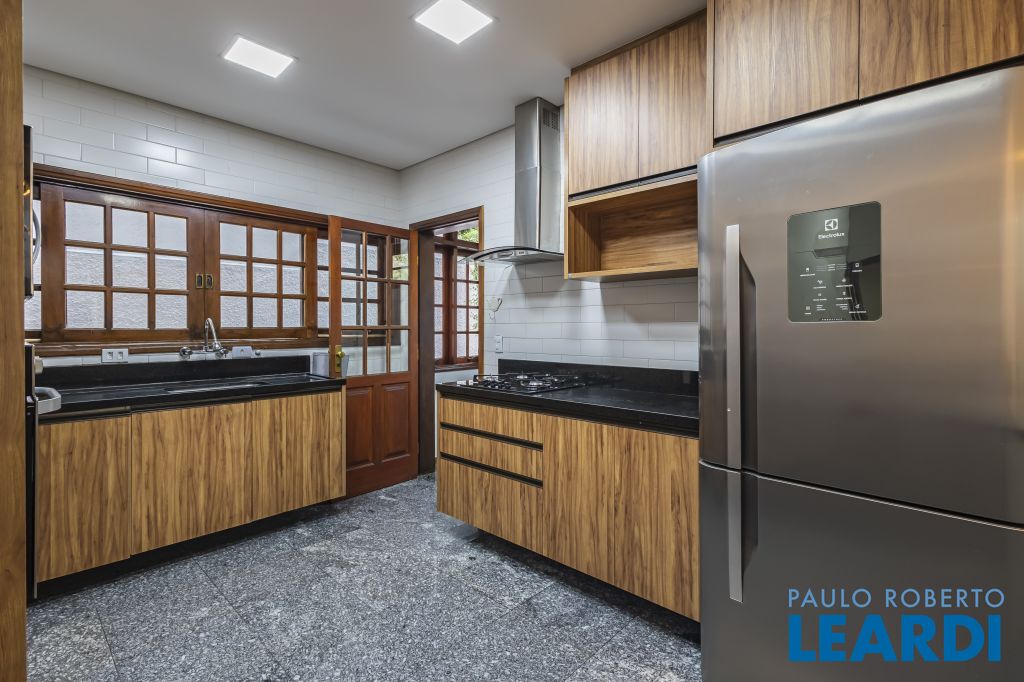 Cozinha equipada com geladeira, micro-ondas, forno, fogão e exaustor