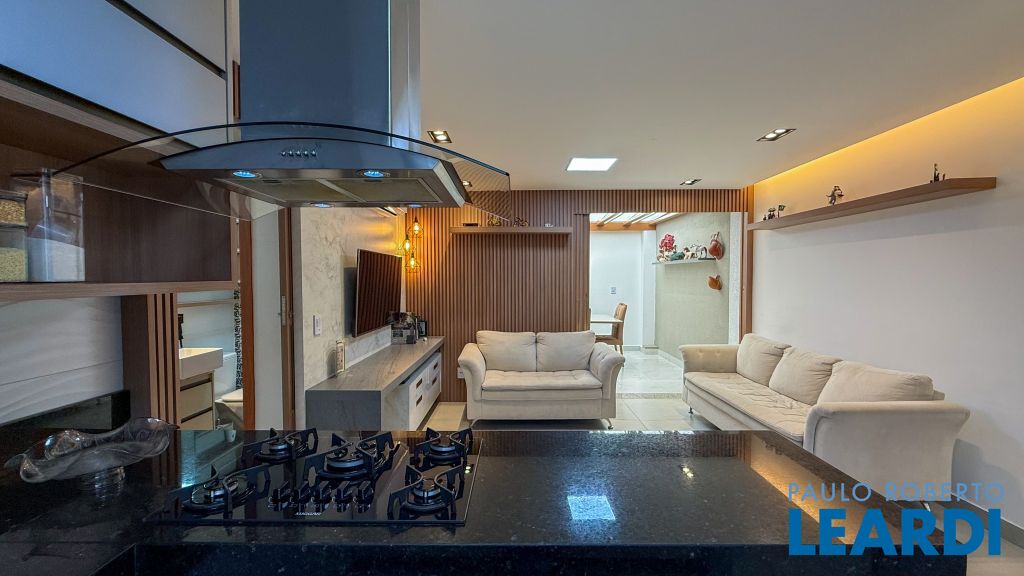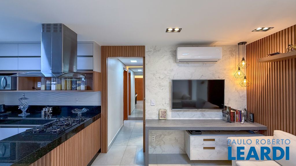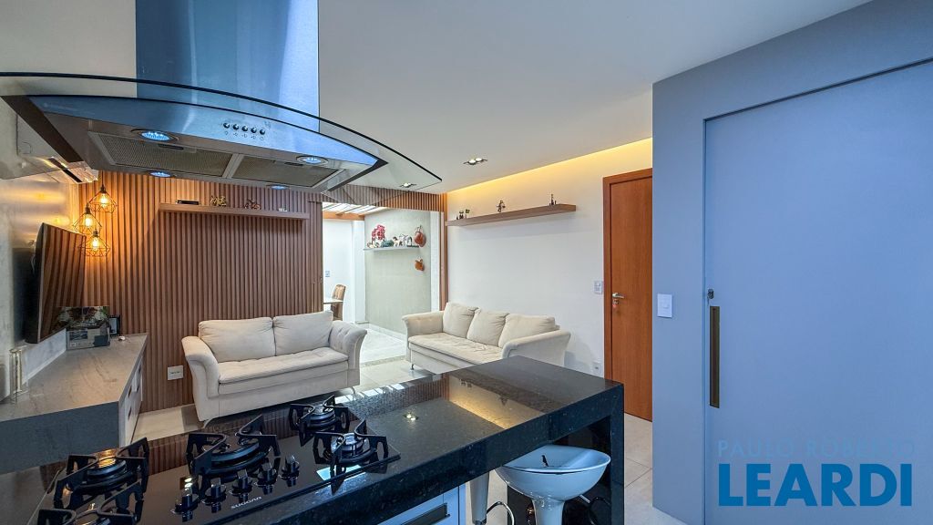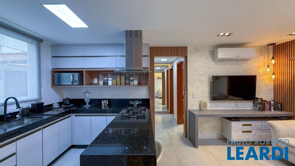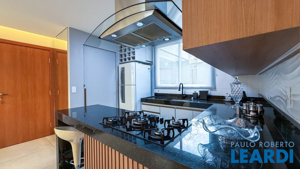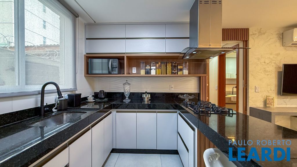 Cozinha americana com bancada em granito, cooktop, coifa de ilha e ar-condicionado