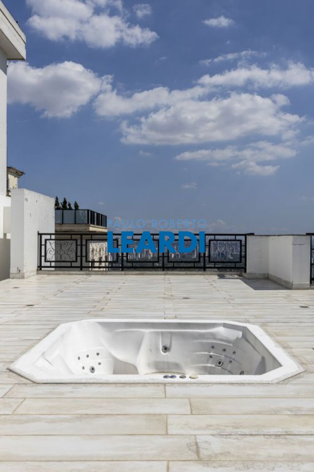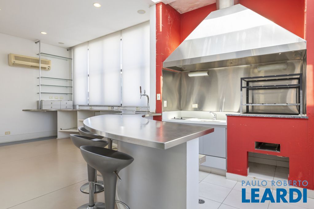 No pavimento superior, a atmosfera é de uma verdadeira casa nas alturas: um grande salão, área gourmet, sauna, vestiário e um espaço delicioso para receber e aproveitar a vista. Hoje, no espaço conta com jacuzzi mas por baixo do piso está a instalação pronta para uma piscina.