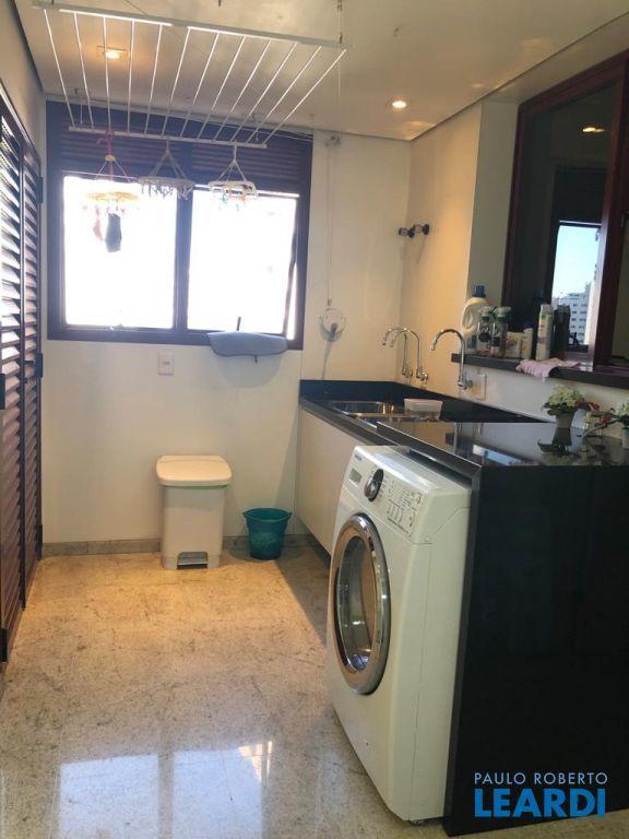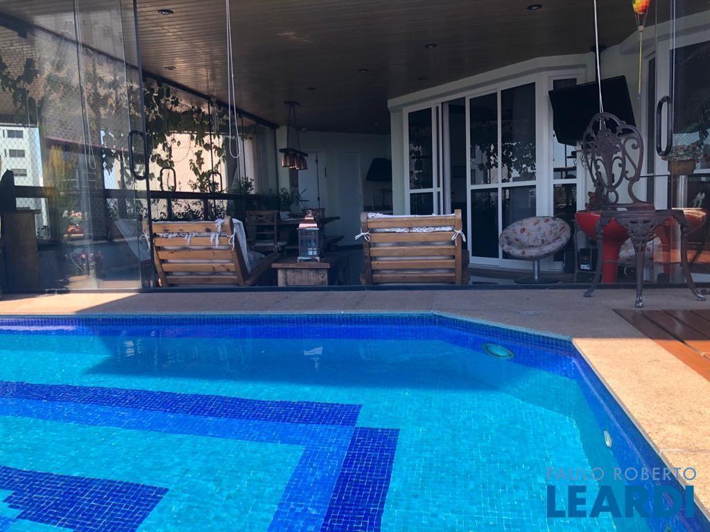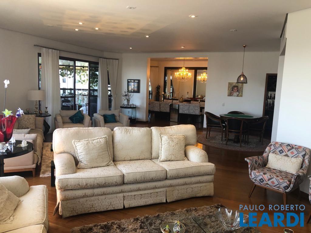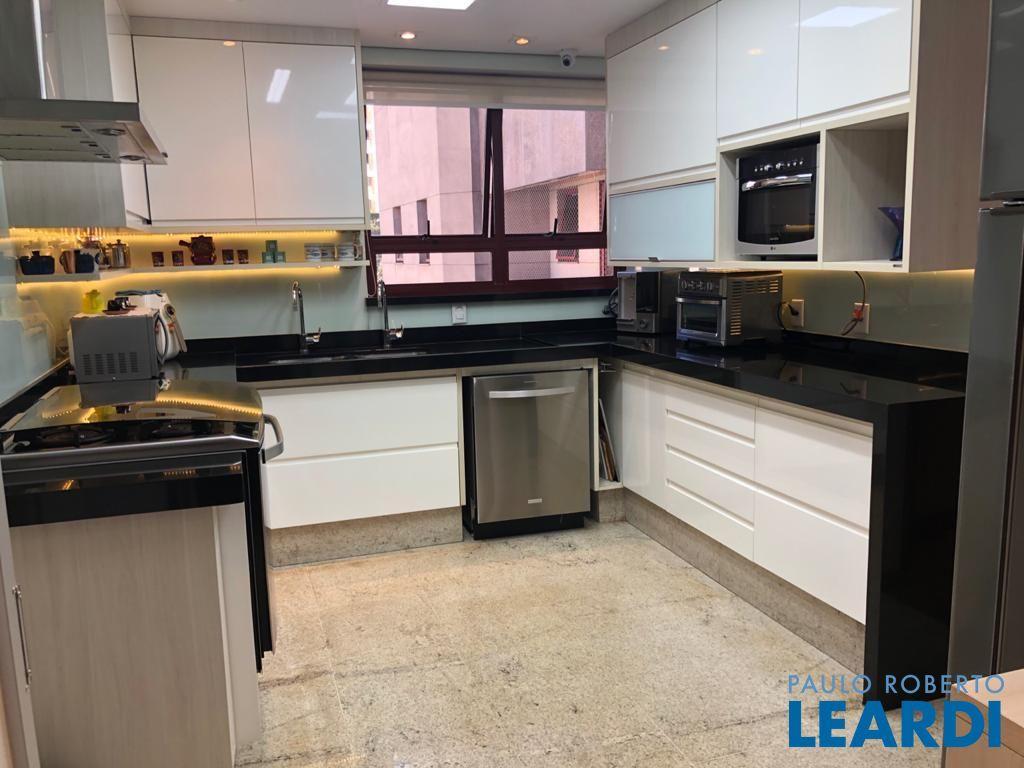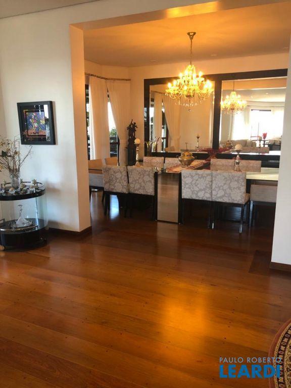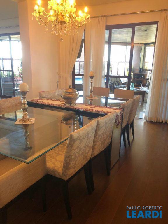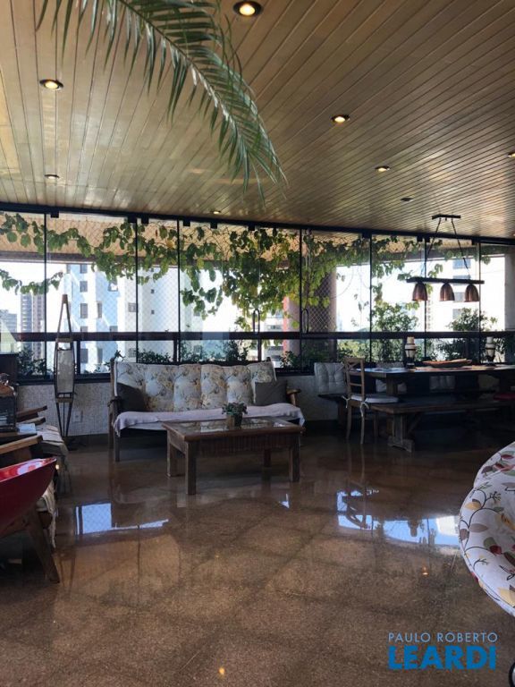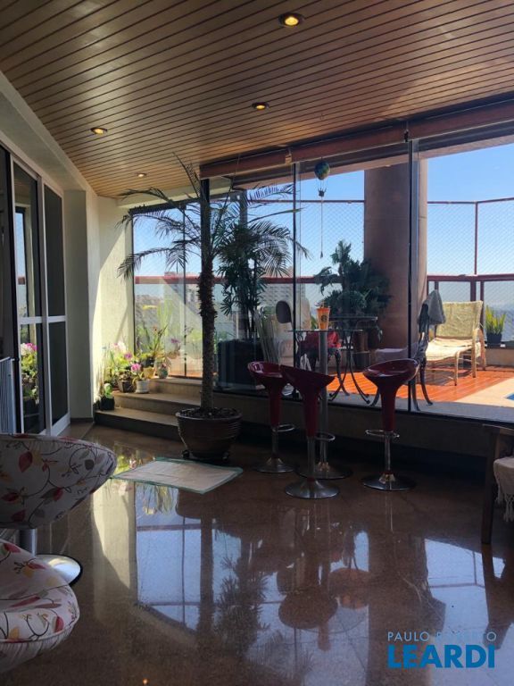 Descrição: PENTHOUSE - Andar Alto - 4 suítes com Ar Condicionado, uma Master com closet Sr e Sra, banheiro Sr. e Sra., banheira Jacuzzi, lareira e local para maquiagens e terraço. Demais suítes com banheira, terraço e persianas automáticas. Hall social exclusivo, lavabo, escritório, sala de TV, living para 3 ambientes com lareira, Ar Condicionado Central, adega fechada, sala de jantar com 12 lugares, sala de almoço para 6 lugares, terraço com 55 m2 com piscina aquecida, sauna e WC. Espaço gourmet com churrasqueira, e mesa para 10 lugares. Cozinha com despensa, área de serviço e dependências e banheiro de empregada, 5 vagas de garagem e Depósito no subsolo.