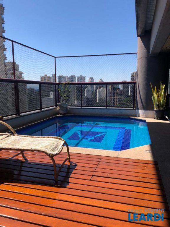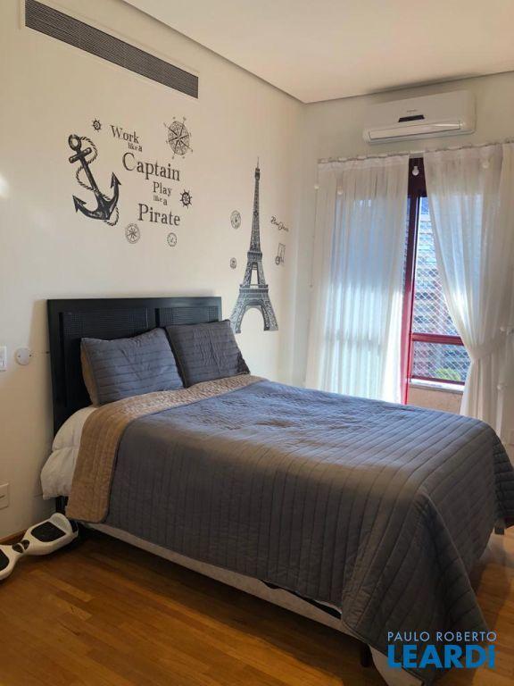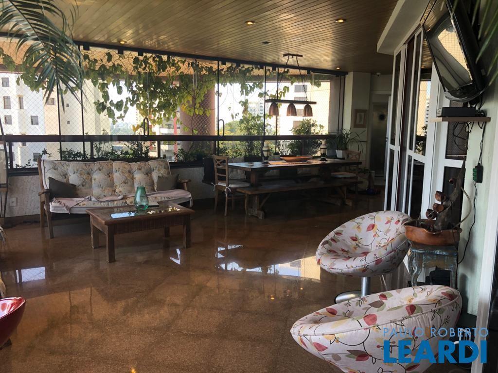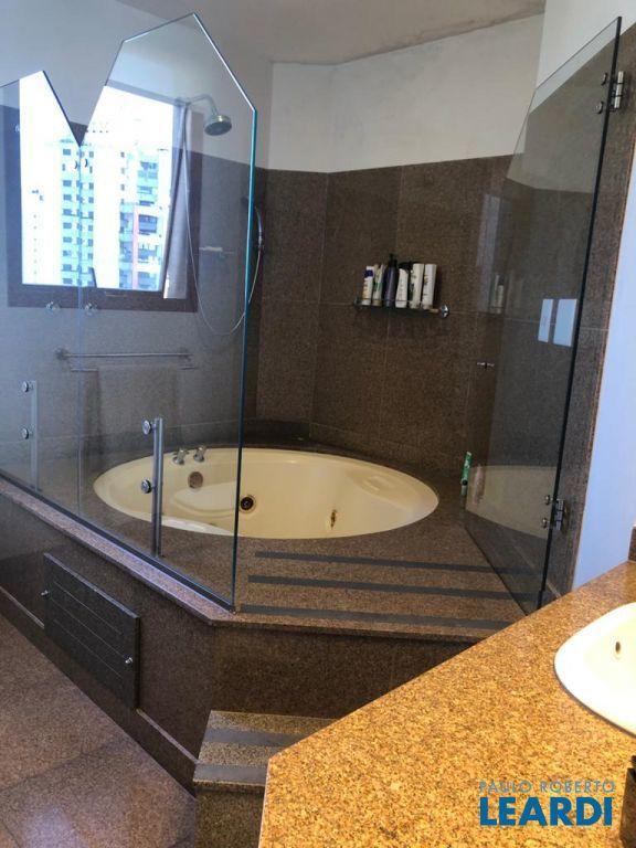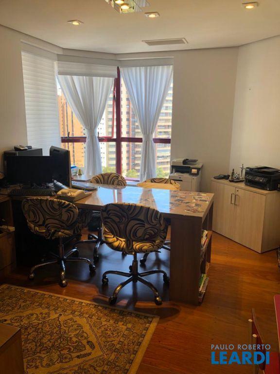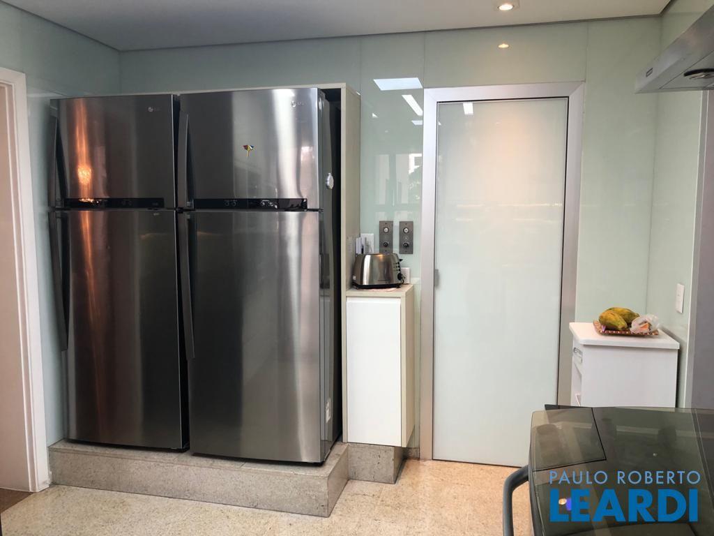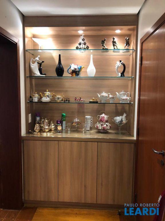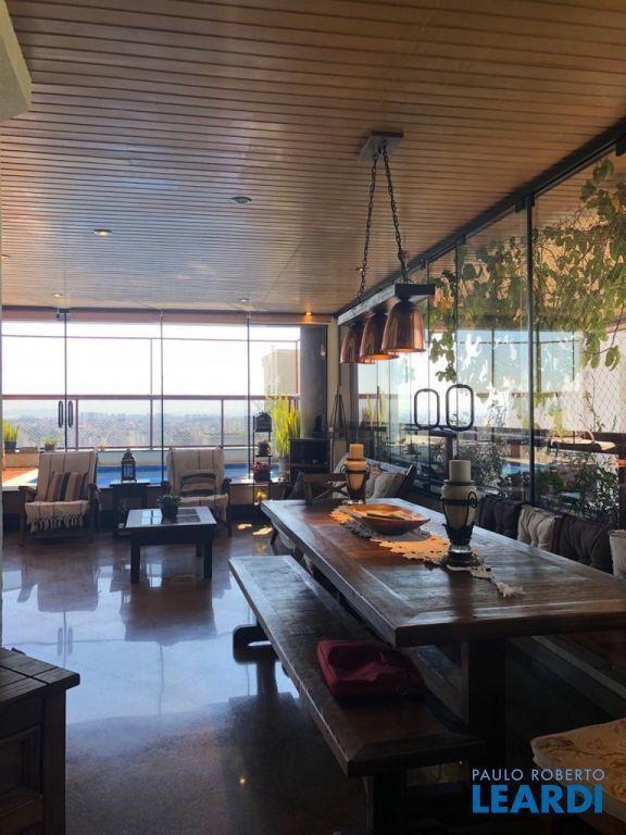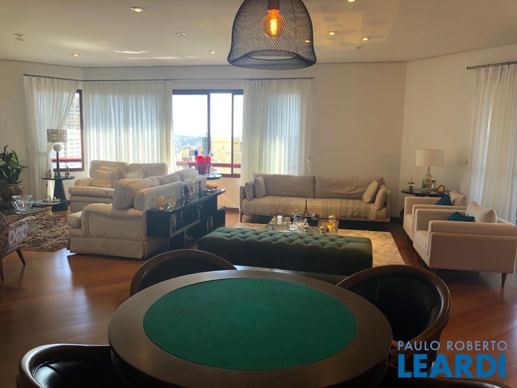 Descrição: PENTHOUSE - Andar Alto - 4 suítes com Ar Condicionado, uma Master com closet Sr e Sra, banheiro Sr. e Sra., banheira Jacuzzi, lareira e local para maquiagens e terraço. Demais suítes com banheira, terraço e persianas automáticas. Hall social exclusivo, lavabo, escritório, sala de TV, living para 3 ambientes com lareira, Ar Condicionado Central, adega fechada, sala de jantar com 12 lugares, sala de almoço para 6 lugares, terraço com 55 m2 com piscina aquecida, sauna e WC. Espaço gourmet com churrasqueira, e mesa para 10 lugares. Cozinha com despensa, área de serviço e dependências e banheiro de empregada, 5 vagas de garagem e Depósito no subsolo.