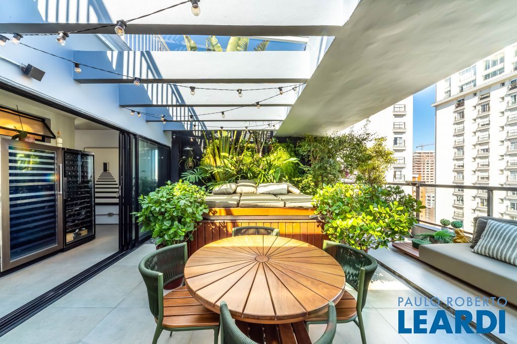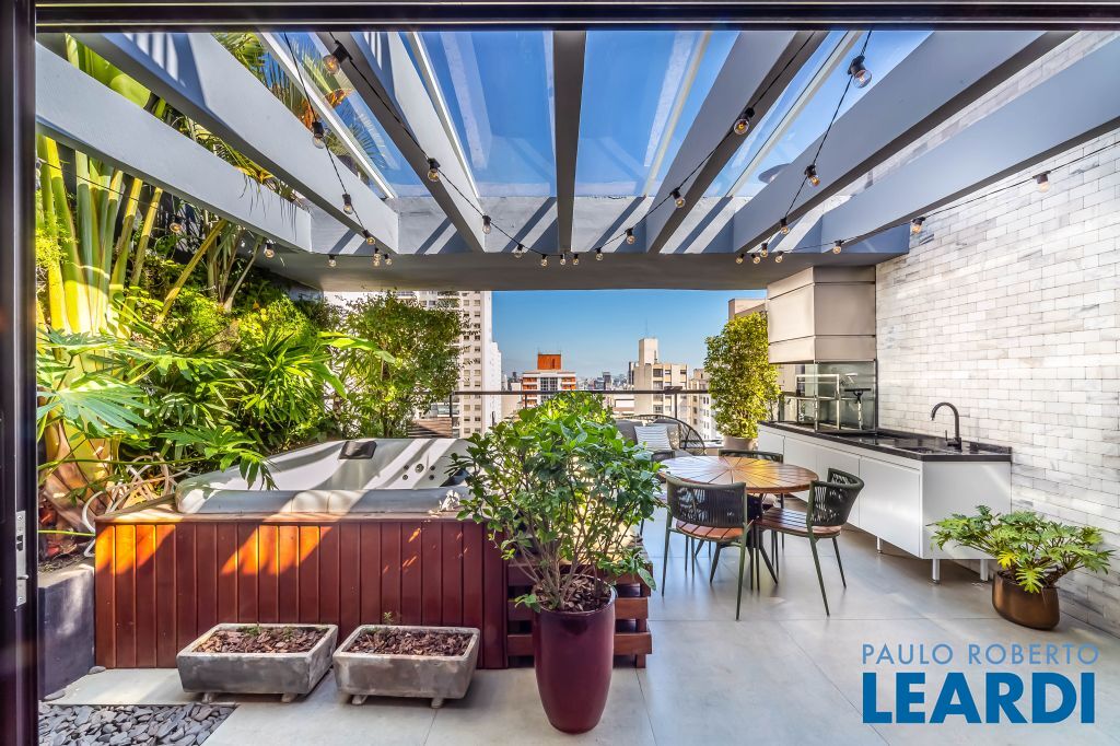 Varanda acolhedora e funcional. A cobertura conta com uma varanda charmosa, que combina vigas aparentes no teto com um belo paisagismo na parede. A jacuzzi, estrategicamente posicionada para aproveitar a vista, e a churrasqueira moderna tornam este espaço perfeito para reunir amigos e aproveitar momentos especiais.