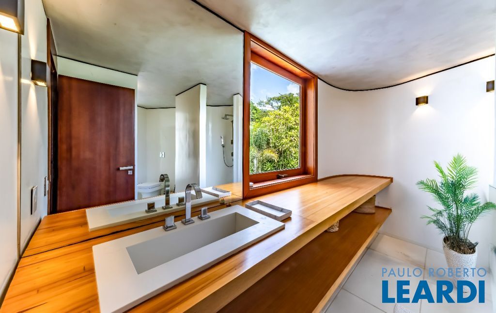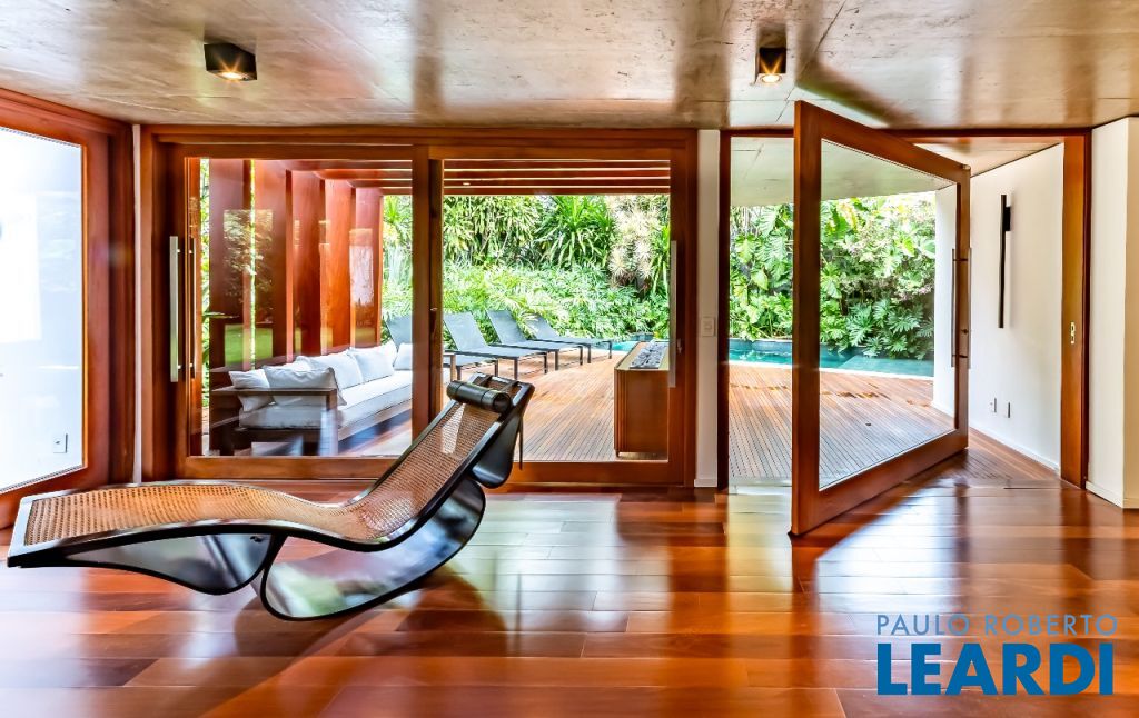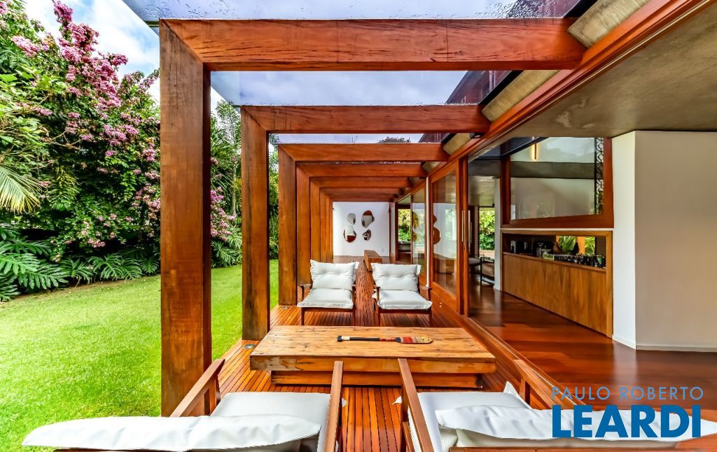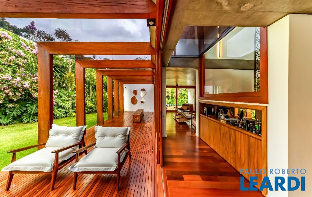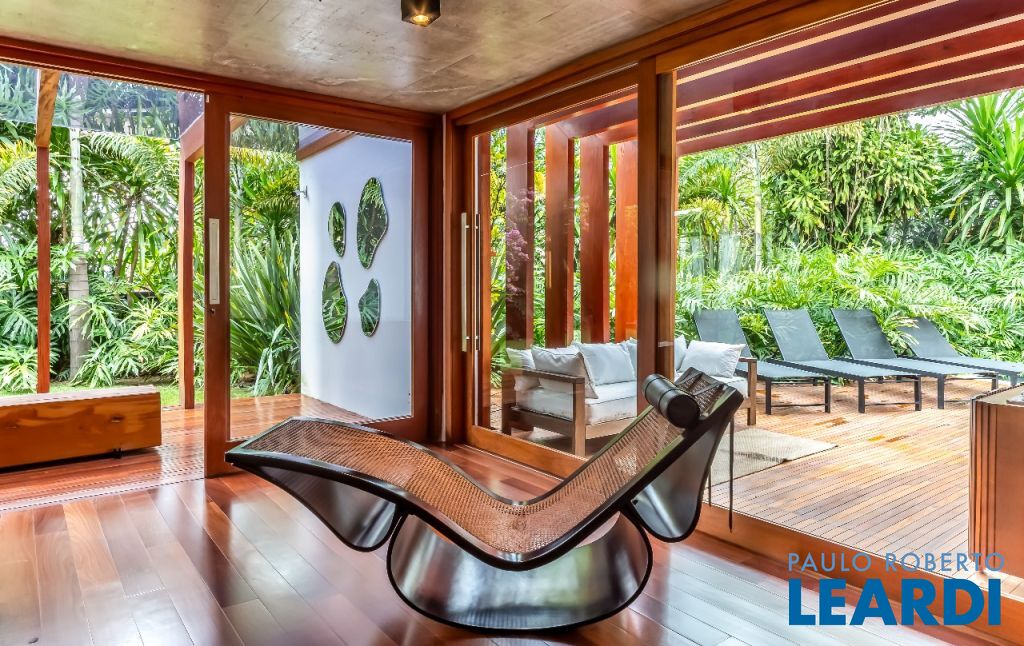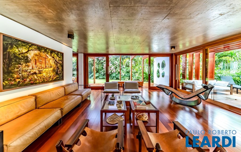 A casa se destaca pelas amplas janelas de vidro que capturam a beleza do paisagismo tropical ao redor. A entrada abundante de luz natural cria um ambiente agradável e sereno, perfeito para quem aprecia a conexão com a natureza e o conforto no dia a dia.