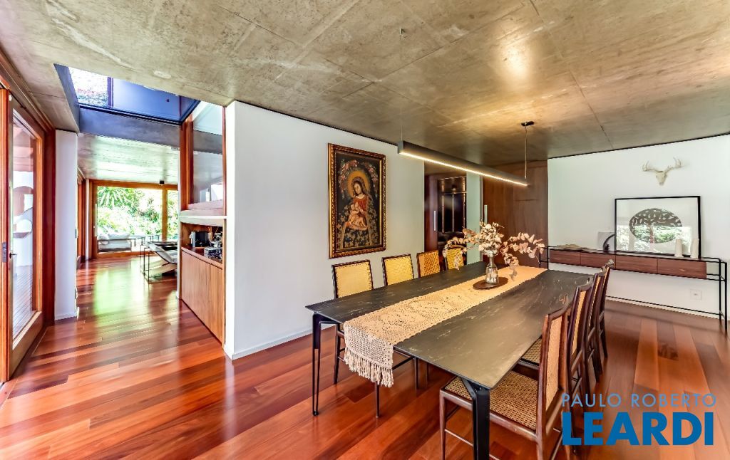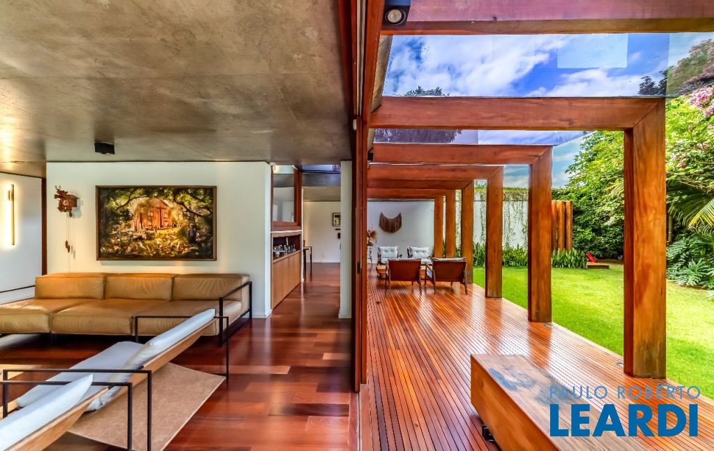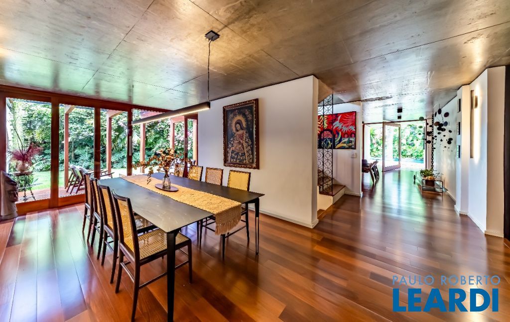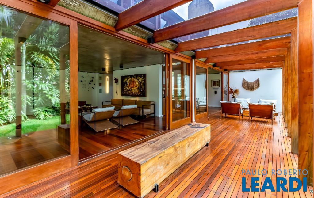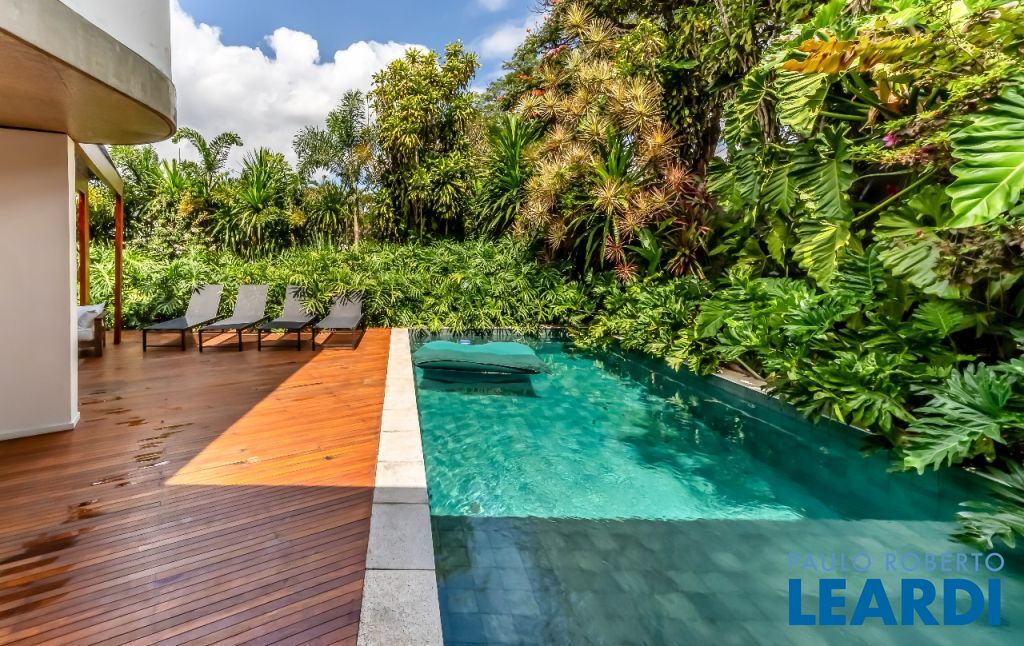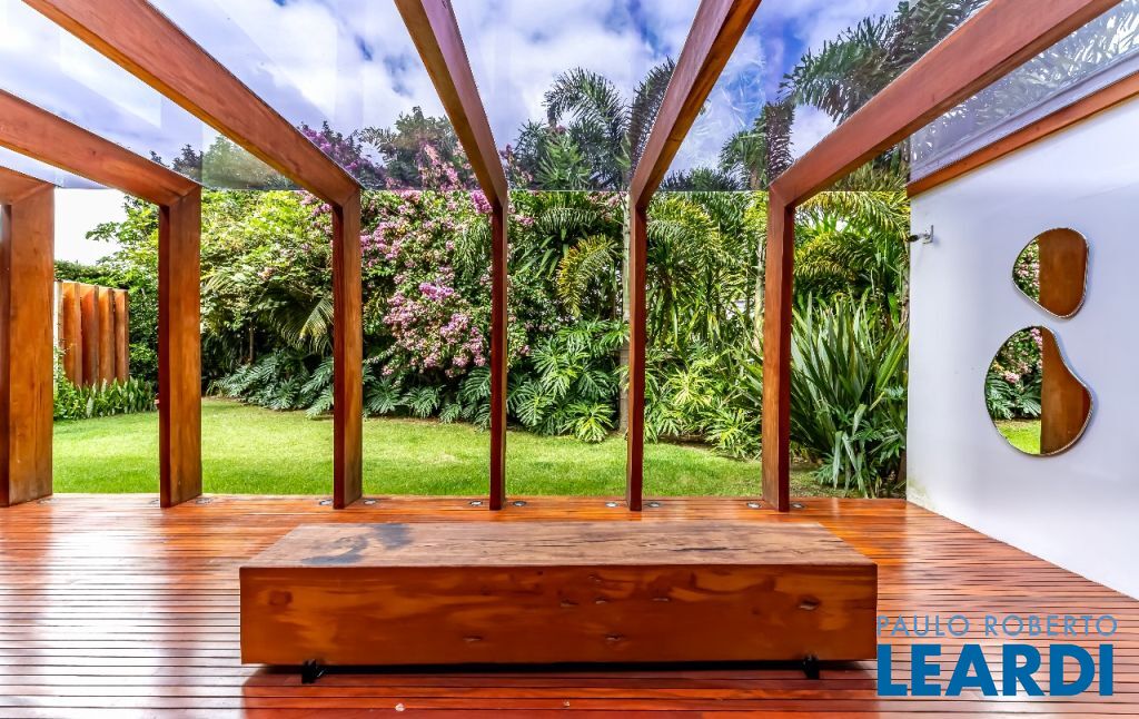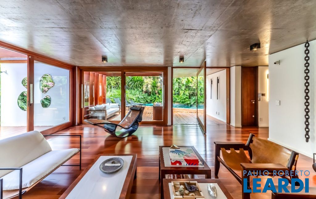 A casa se destaca pelas amplas janelas de vidro que capturam a beleza do paisagismo tropical ao redor. A entrada abundante de luz natural cria um ambiente agradável e sereno, perfeito para quem aprecia a conexão com a natureza e o conforto no dia a dia.