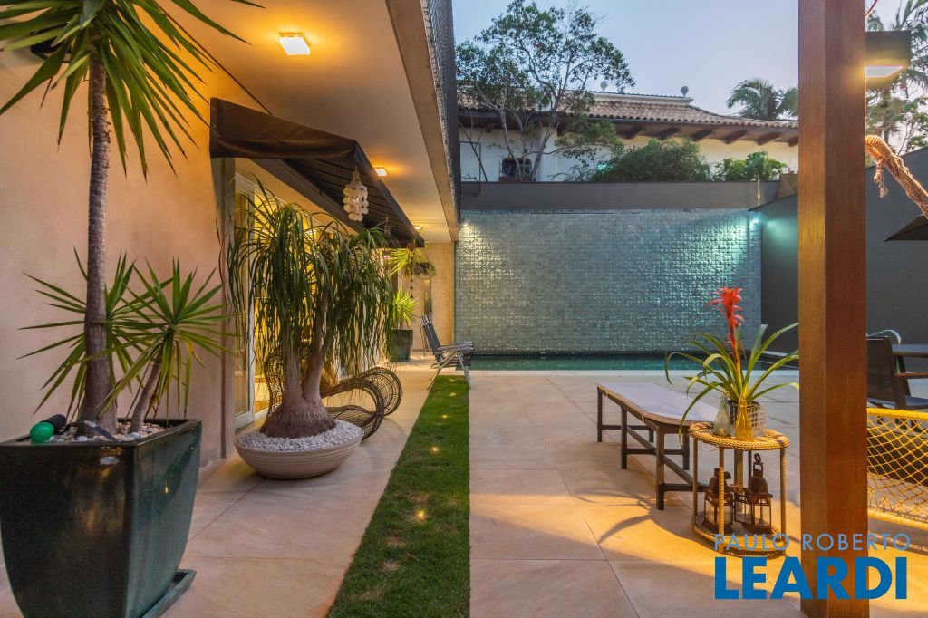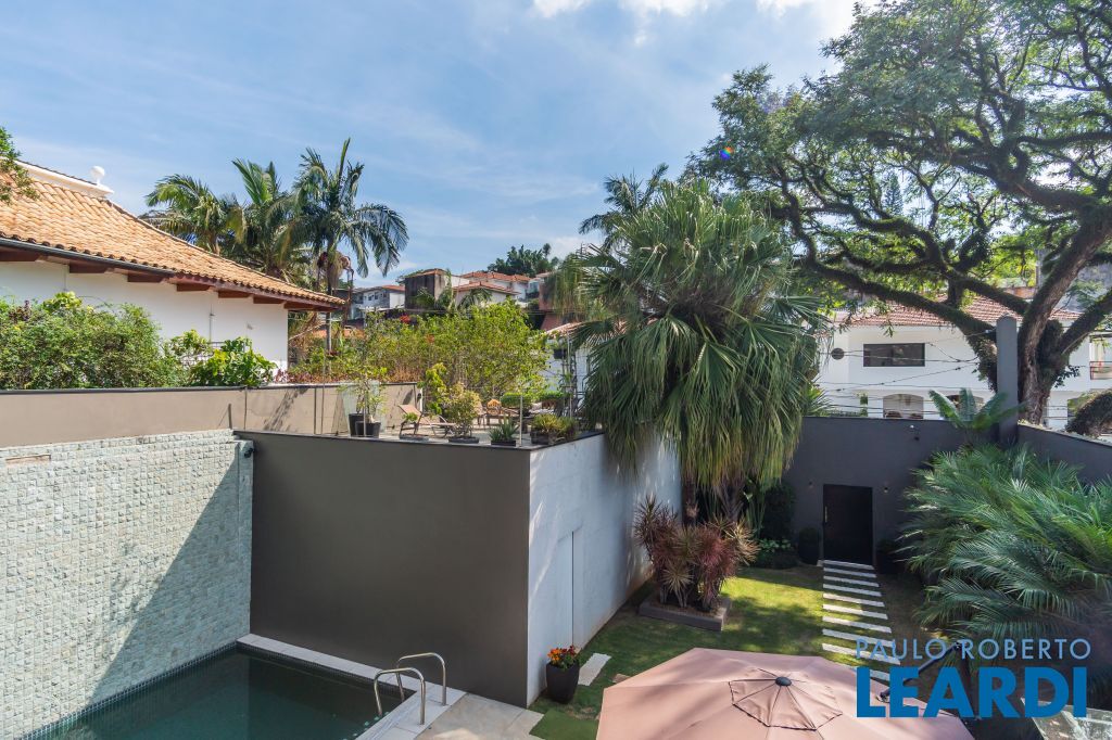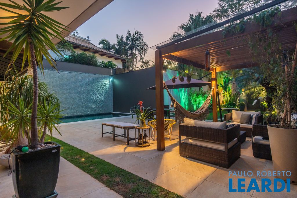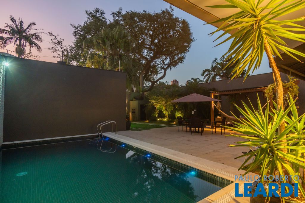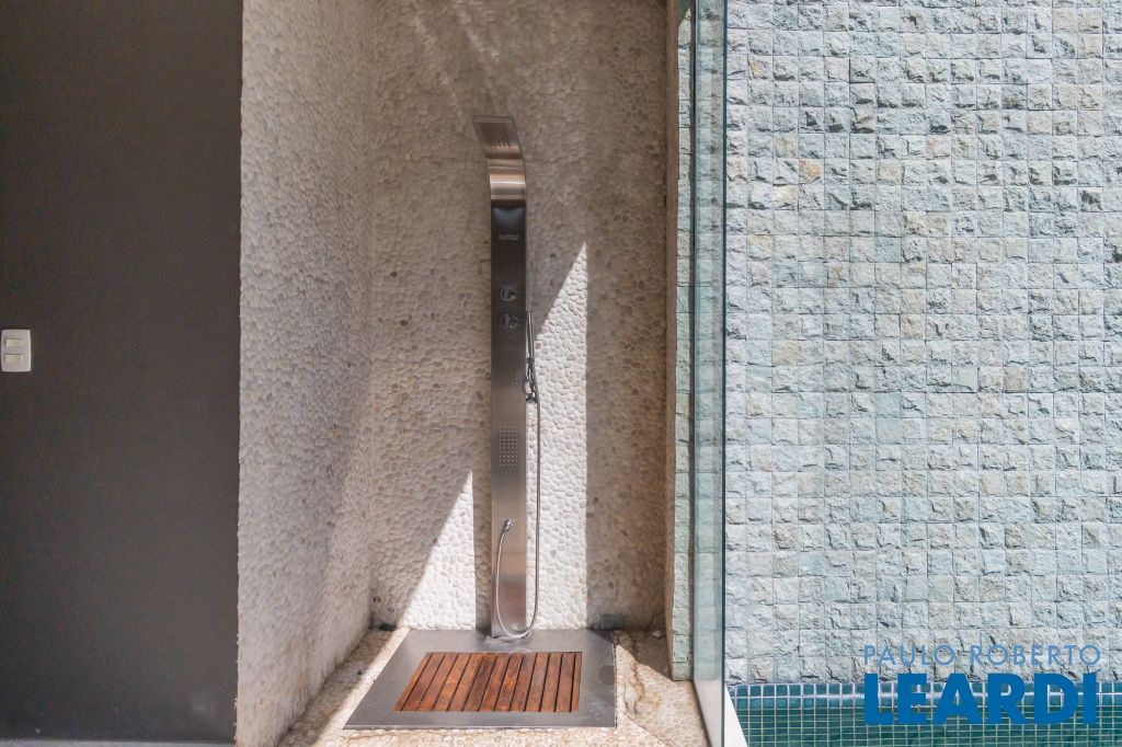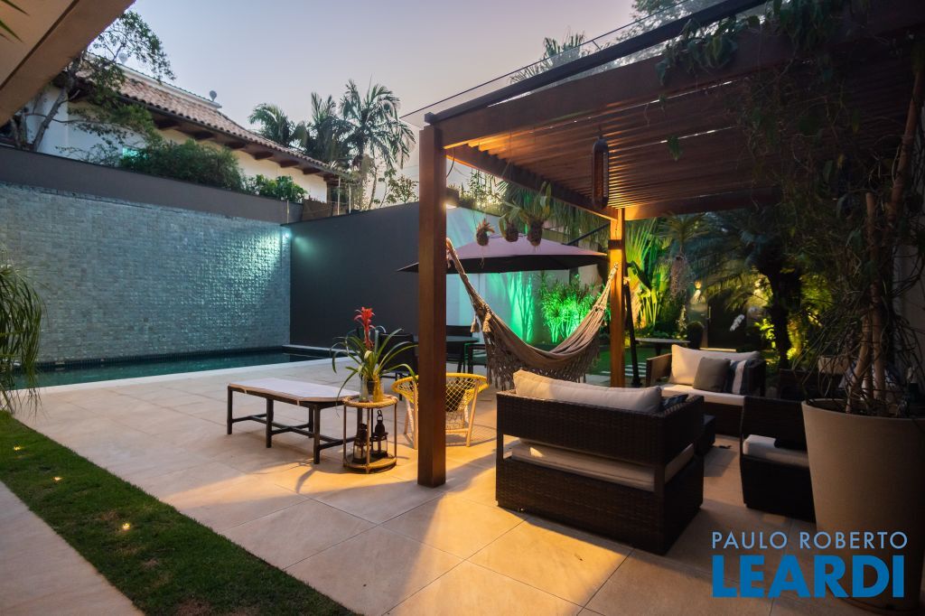 No térreo uma piscina em formato retangular climatizada e com cascata integrada ao jardim; Roof top com ambiente muito interessante, integrado às árvores do terreno;