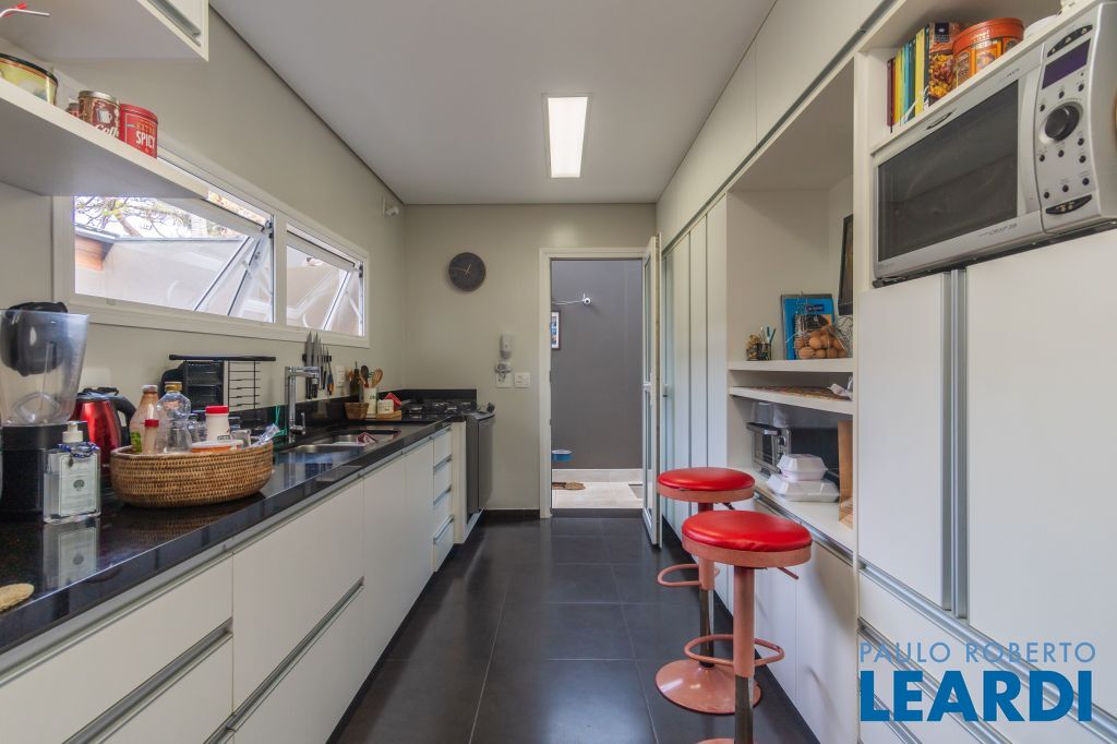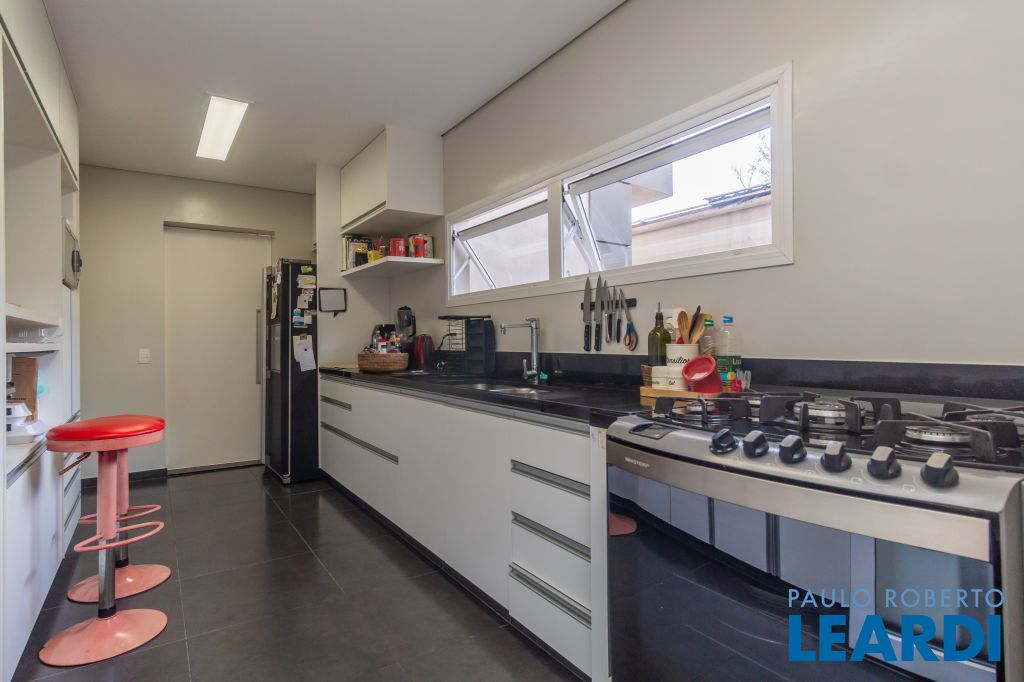 Cozinha equipada com ótimos armários, isolada da parte social, com acesso à área de lavanderia e aposentos dos funcionários.