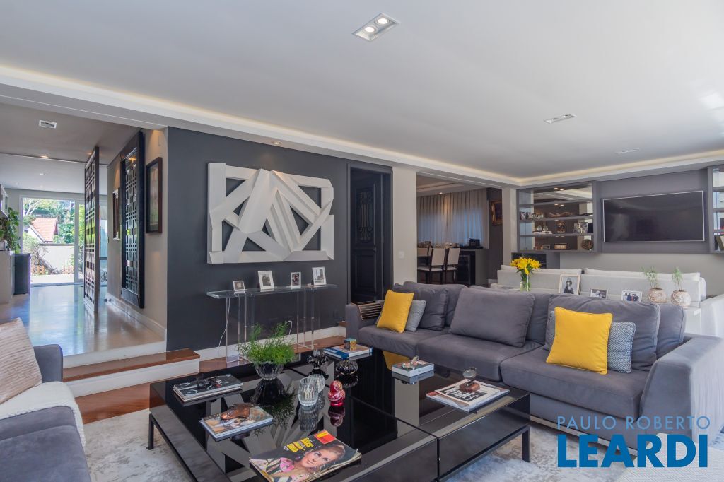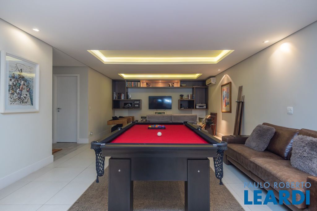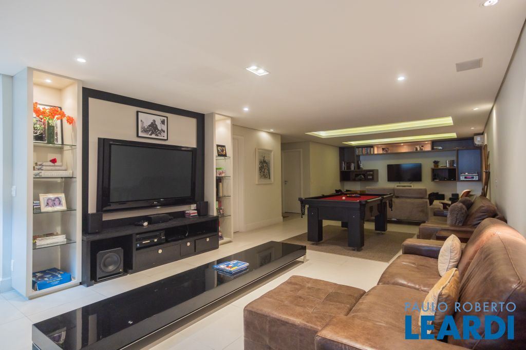 Amplo ambiente com acesso através da área da sala de almoço possuindo sala de bilhar, home theather e escritório; 5ª suíte no mesmo nível inferior.