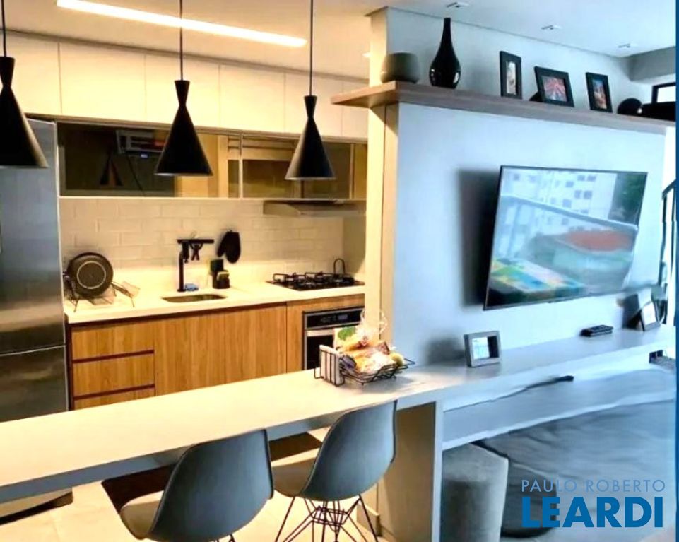 Com boa sala, cozinha americana, bancada para duas (2) refeições.